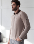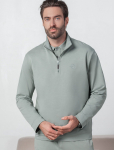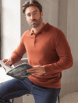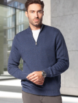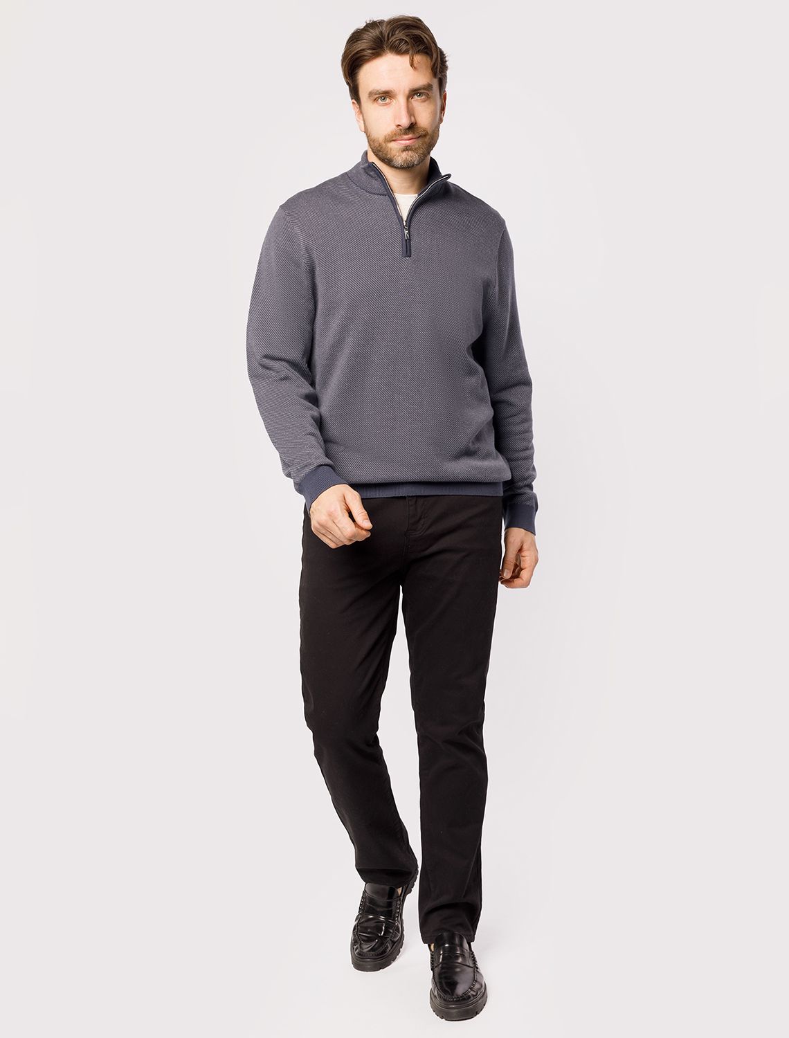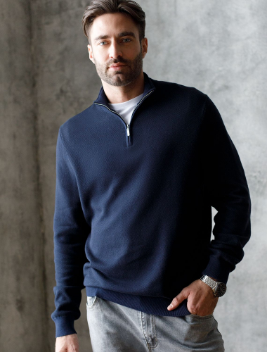 Серый джемпер с длинными рукавами выполнен из мягкой хлопковой пряжи с добавлением акрила. Высокий воротник застегивается молнией. За счет переплетения светлых и темных нитей получилась фактурная меланжевая модель, которая, отлично держит тепло и почти не ощущается на теле. Сочетается с футболками, денимом и с чиносами, любой обувью.