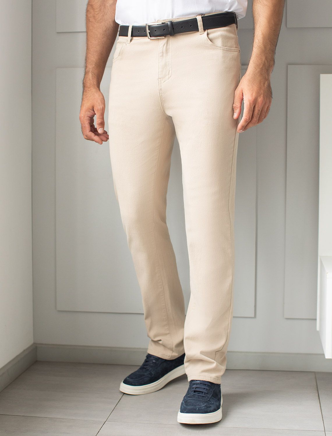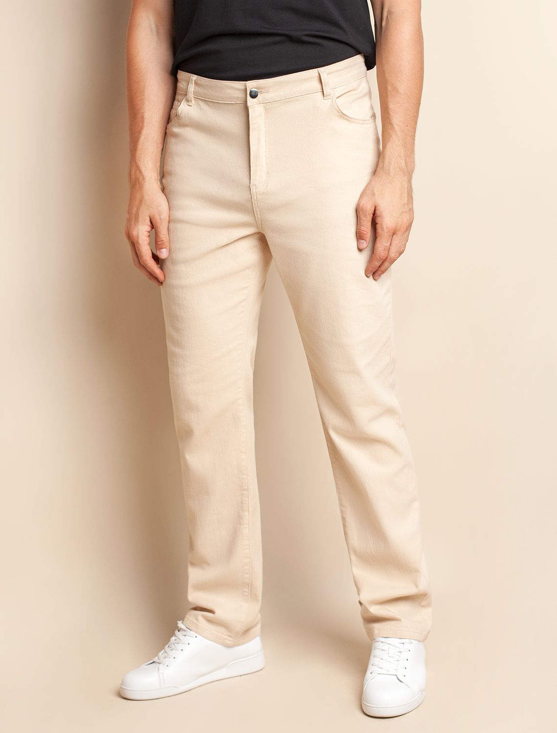 Бежевые брюки, слегка зауженные к низу, выполнили из 100% хлопкового денима. Изделие комфортно садится по фигуре, обеспечивая свободу движений. Легко сочетается со всеми цветами одежды. Модель дополнили высококачественной фурнитурой бренда. бежевый