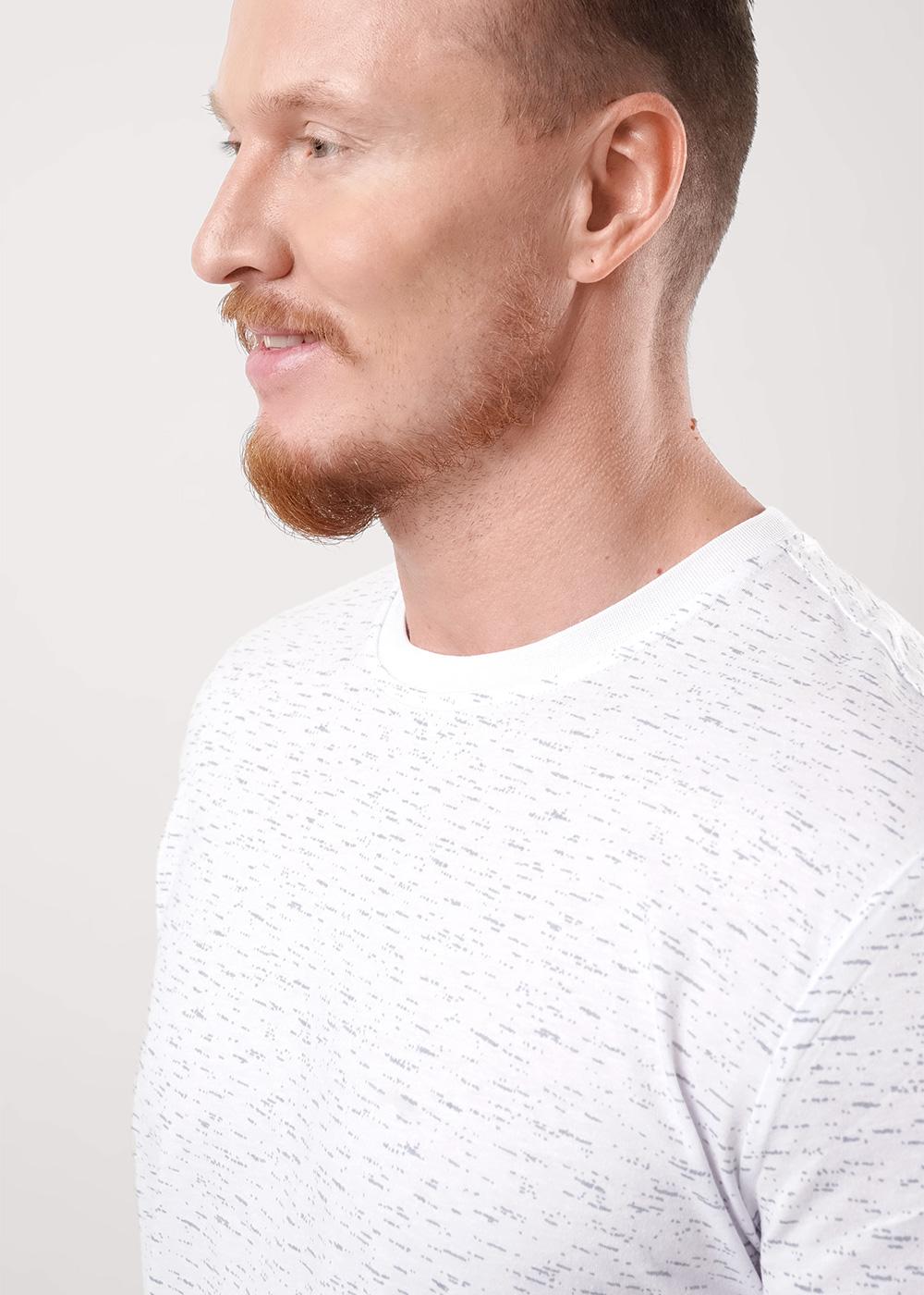 Фуфайка с коротким рукавом среднего объема, круглым вырезом горловины, которая оформлена обтачкой из рибаны, выполненная из набивного полотна.