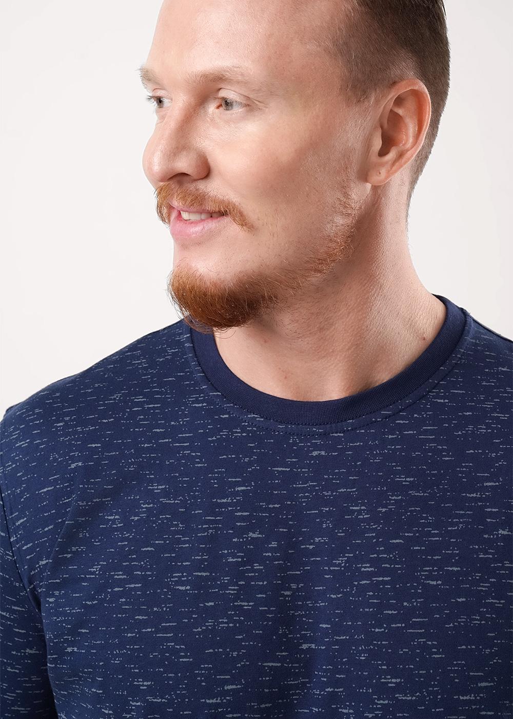 Фуфайка с коротким рукавом среднего объема, круглым вырезом горловины, которая оформлена обтачкой из рибаны, выполненная из набивного полотна.