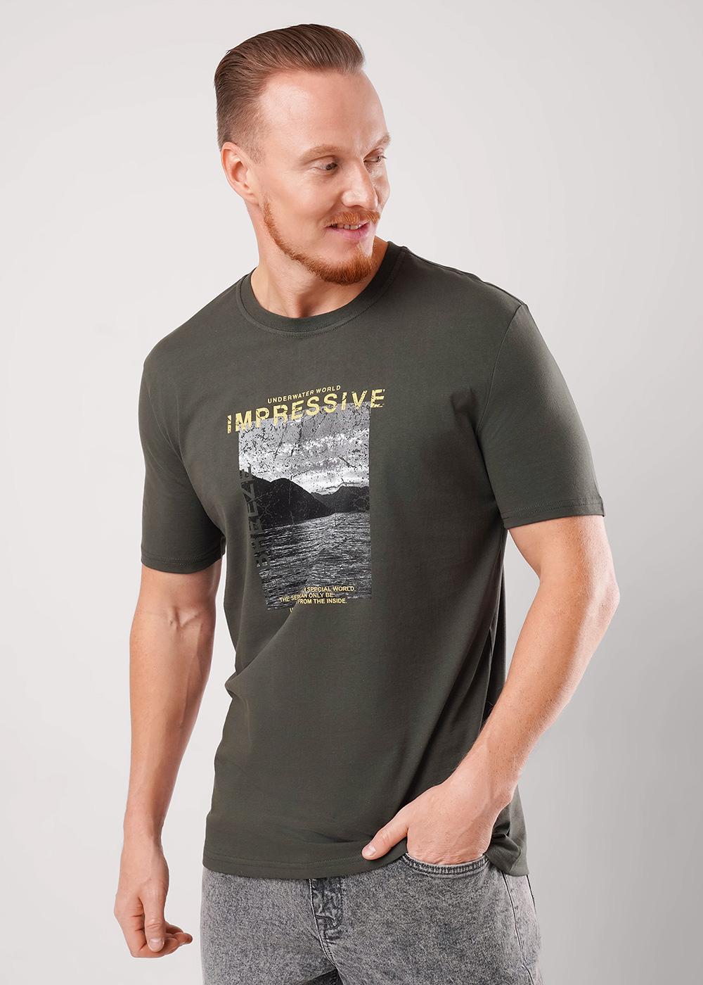 "Описание: Фуфайка с коротким рукавом среднего объема, круглый вырез, горловина оформлена обтачкой из рибаны. Дополнена оригинальным принтом.