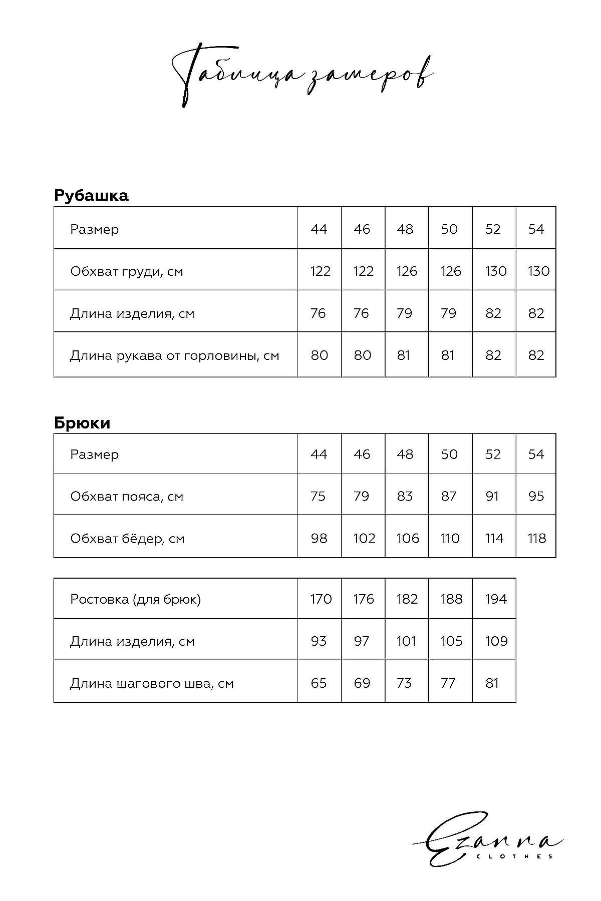 Рубашка свободного кроя, со спущенной линией плеча, застегивается на кнопки. Накладные карманы без клапана, декорированы именным шевроном с логотипом Ezanna. Брюки прямого без манжетов по низу, чуть зауженного кроя, пояс выполнен из эластичного кашкорсе, удобные боковые карманы.