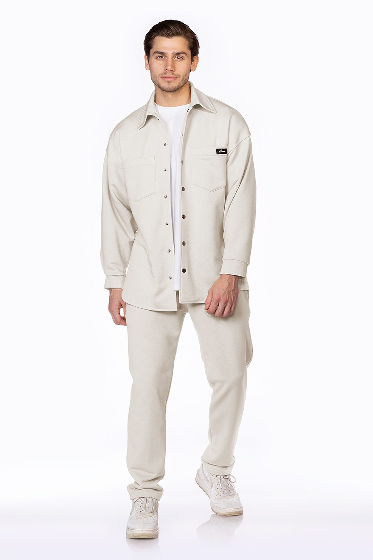 Рубашка свободного кроя, со спущенной линией плеча, застегивается на кнопки. Накладные карманы без клапана, декорированы именным шевроном с логотипом Ezanna. Брюки прямого без манжетов по низу, чуть зауженного кроя, пояс выполнен из эластичного кашкорсе, удобные боковые карманы.