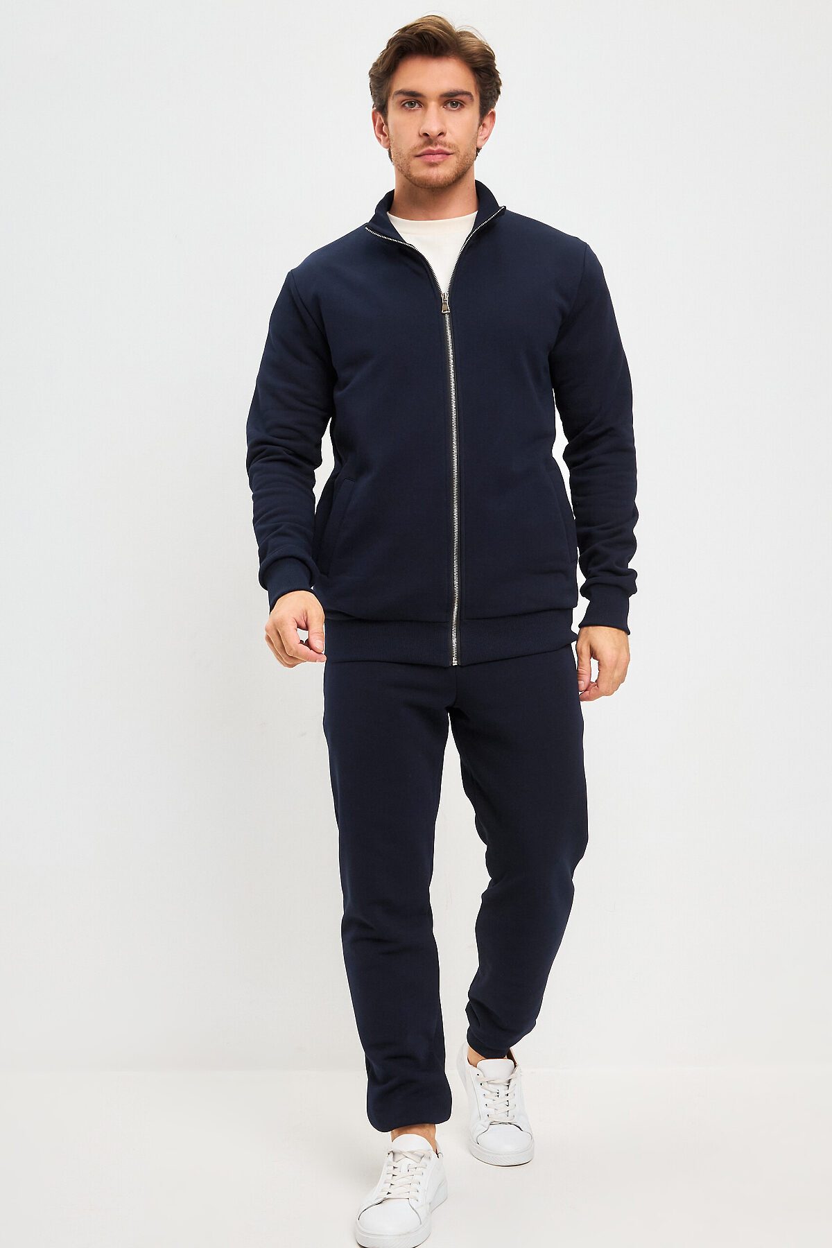 Толстовка прямого кроя, с втачным рукавом и воротом стойкой, с застежкой на металлическую молнию. Модель с боковыми прорезными карманами с листочкой. Манжет, ворот и низ изделия выполнен из качественного эластичного материала в рубчик.