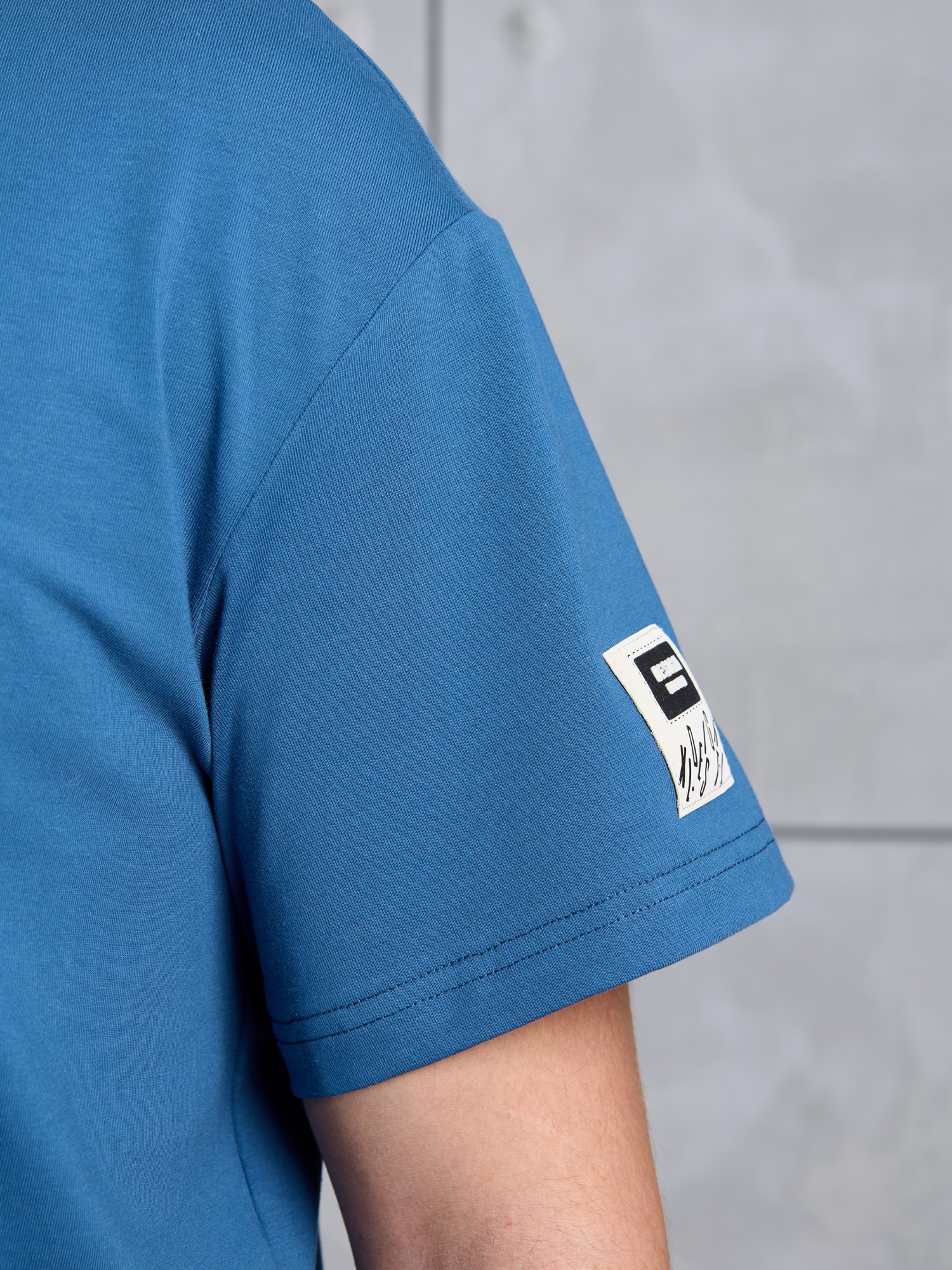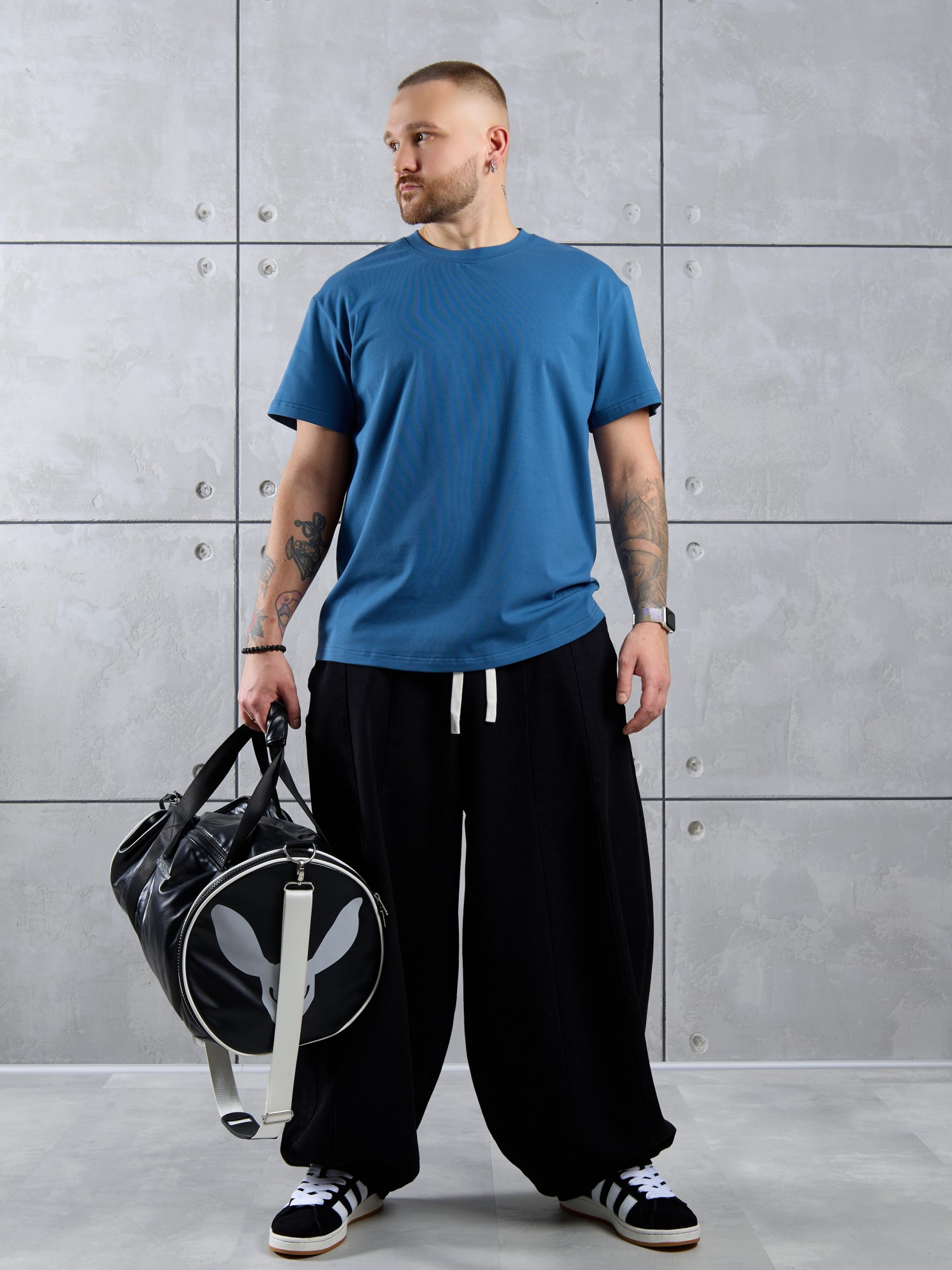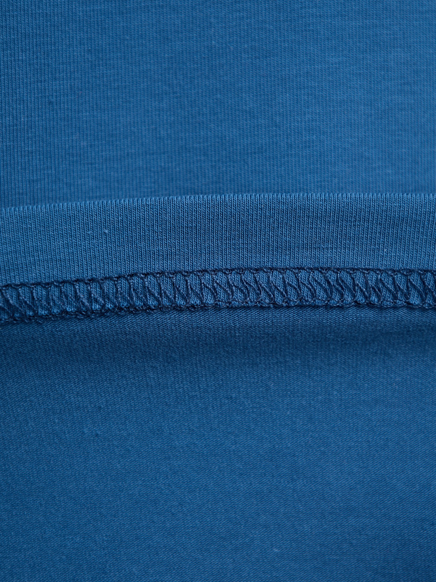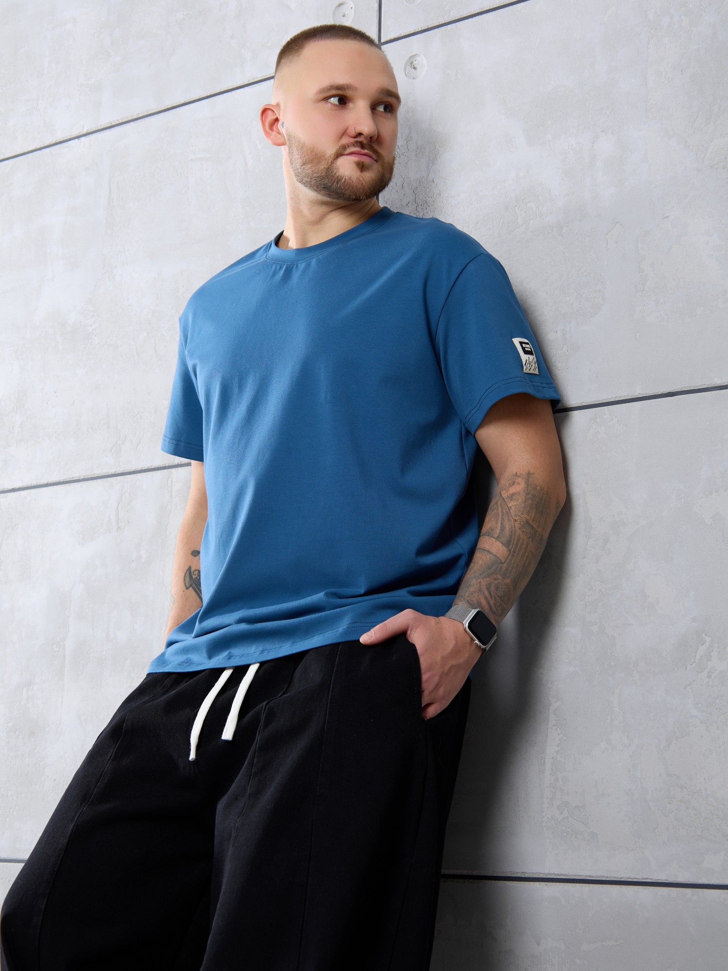 Футболка мужская из гладкокрашеного трикотажного полотна "кулирка с лайкрой"классического покроя со слегка удлиненными плечевыми швами, короткими втачными рукавами и горлорвиной овальной формы, обработанной втачной планкой. На левом рукаве настрочен декоративный элемент прямоугольной формы. По горловине настрочена двойная отделочная строчка. Низ рукавов и изделия обработаны подгибкой.