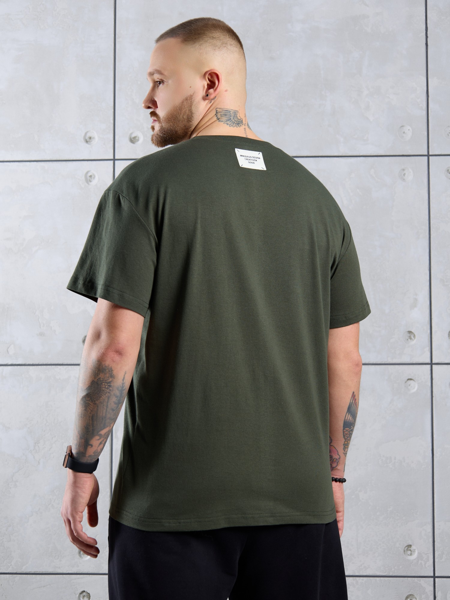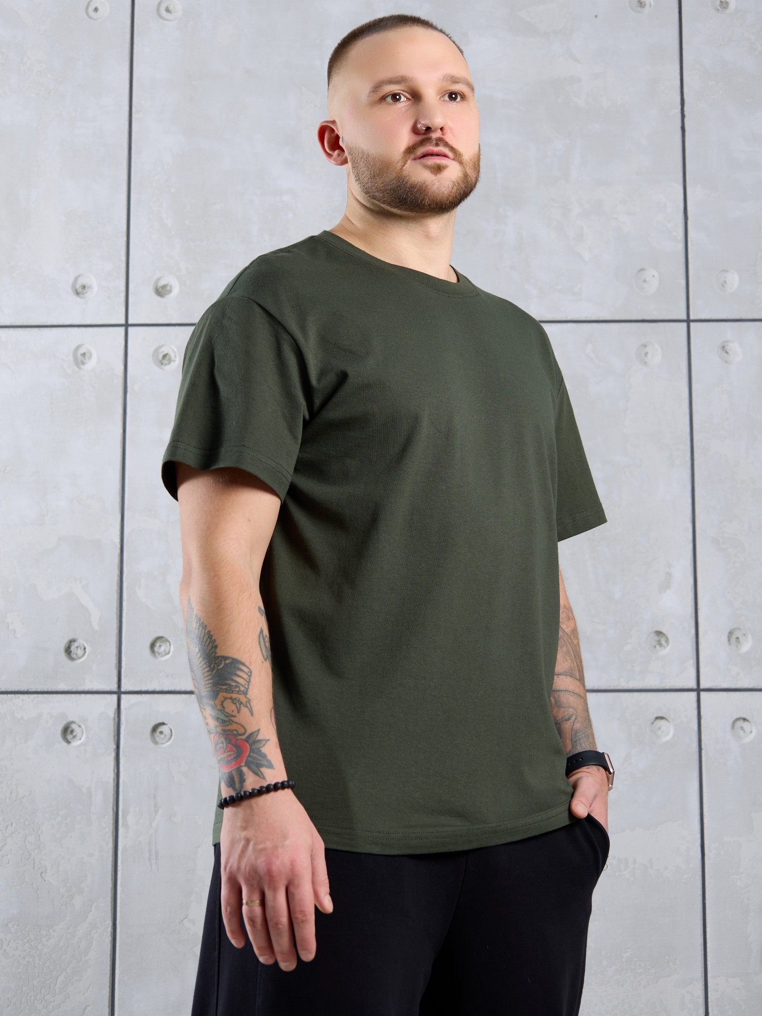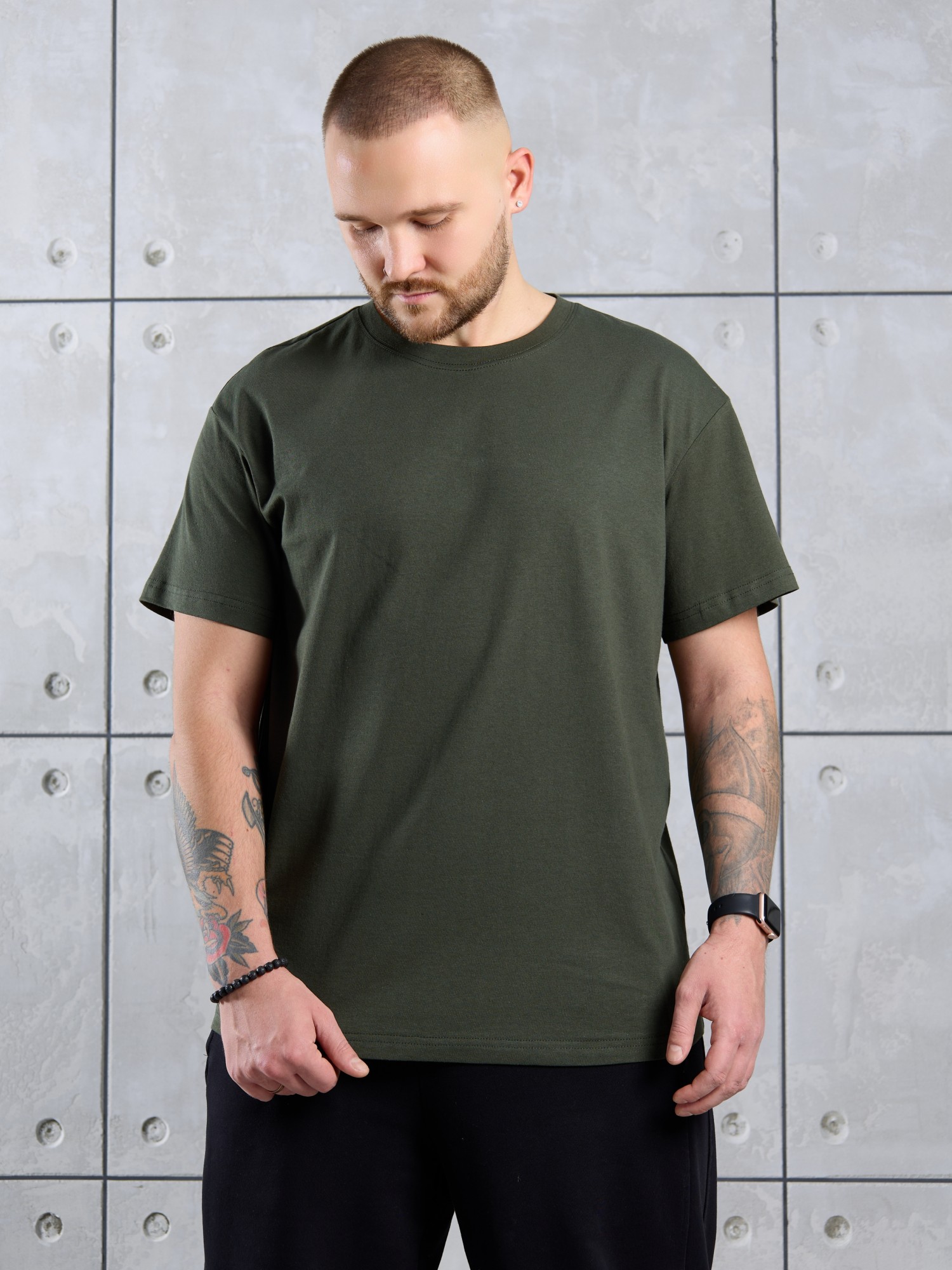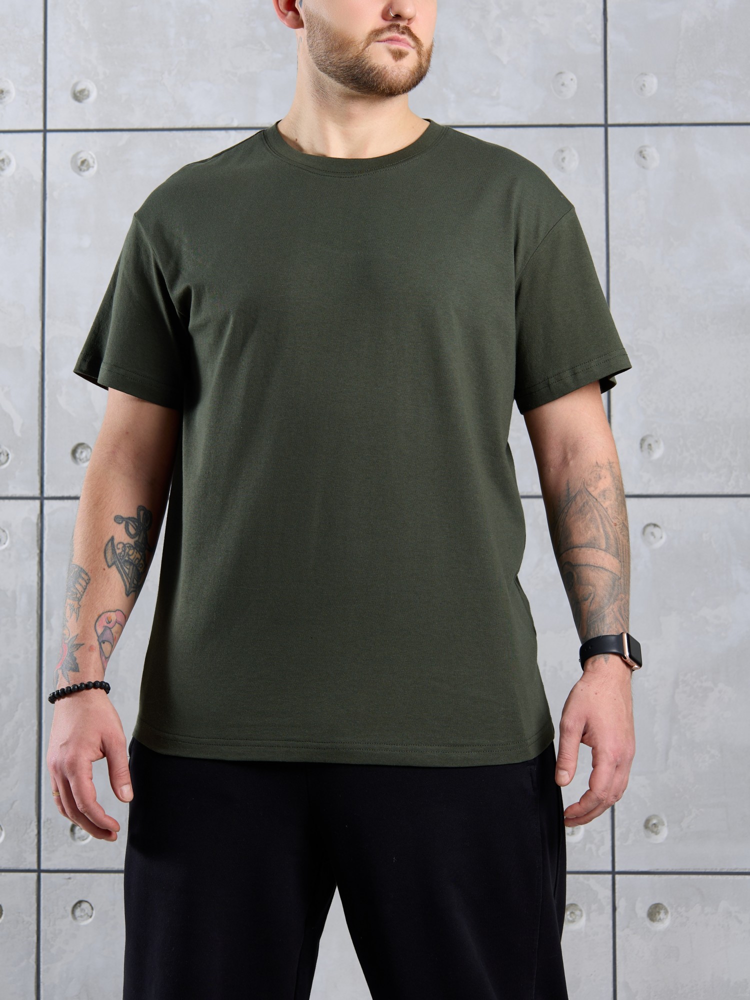 Футболка мужская из гладкокрашеного трикотажного полотна "кулирка" классического покроя со слегка удлиненными плечевыми швами, короткими втачными рукавами и горлорвиной овальной формы, обработанной втачной планкой. В центре верхней части спинки настрочен декоративный элемент прямоугольной формы. По горловине настрочена двойная отделочная строчка. Низ рукавов и изделия обработаны подгибкой.