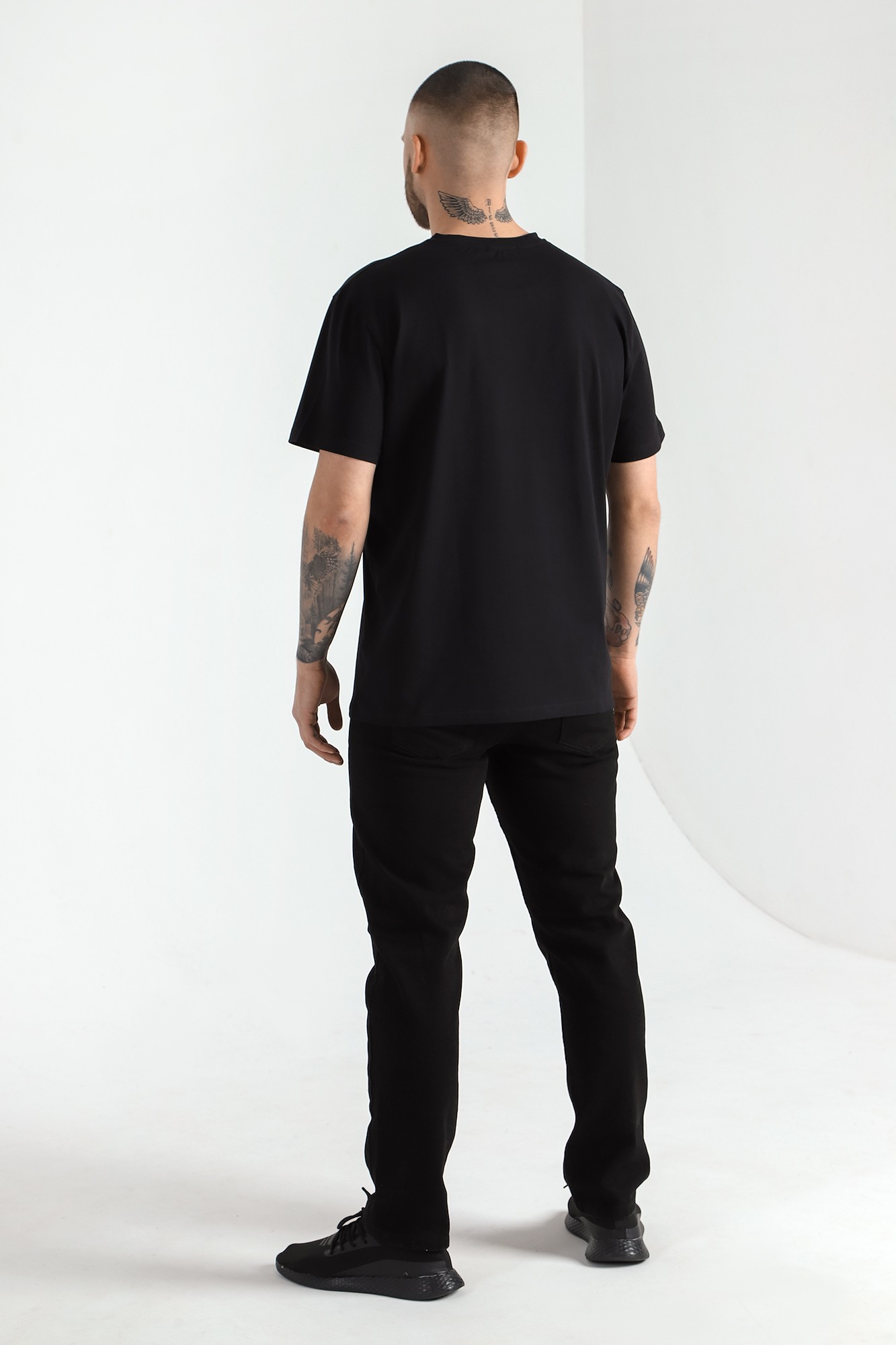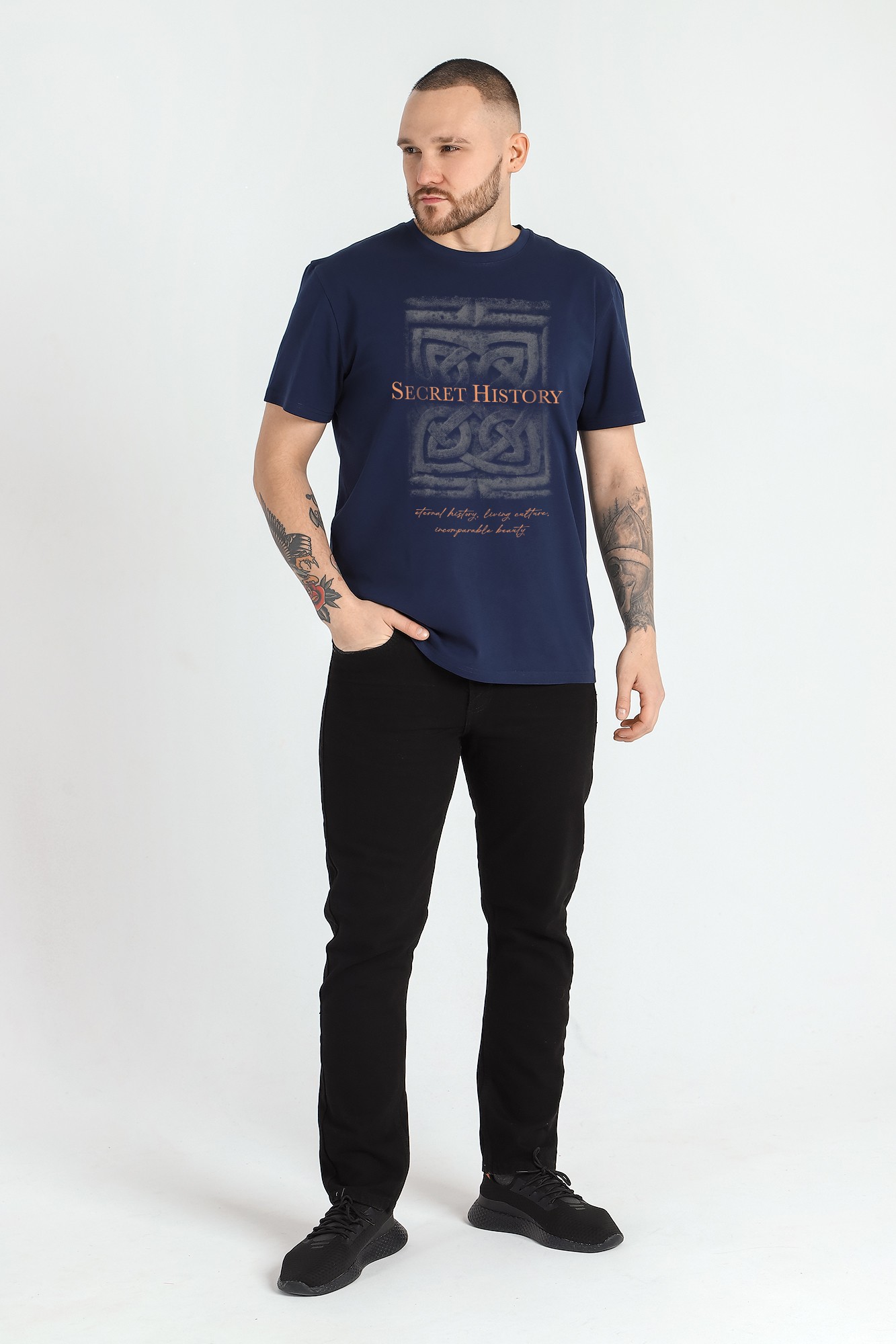 Футболка мужская из гладкокрашеного трикотажного полотна "кулирка" с лайкрой, классическогоь покроя, с коротким втачными рукавами, горловиной овальной формы, обработанной втачной планкой и принтом на полочке, выполненным в технике шелкографии.