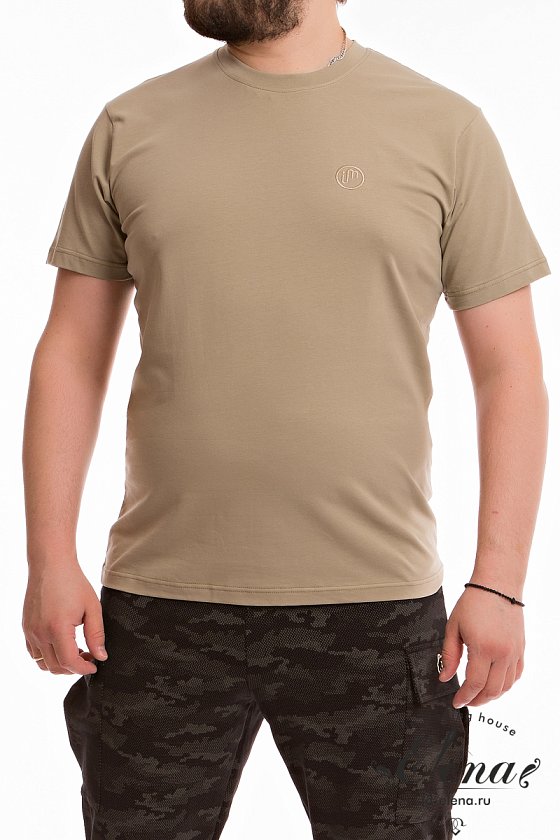 Мужская футболка выполнена из хлопкового полотна с добавлением лайкры. Горловина имеет круглый вырез, рукава короткие. Спереди вышивка.