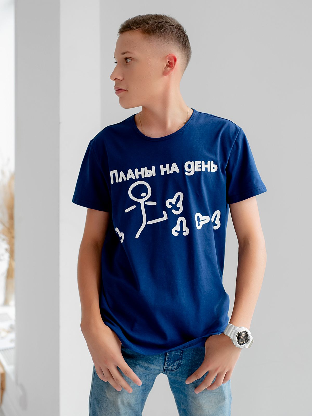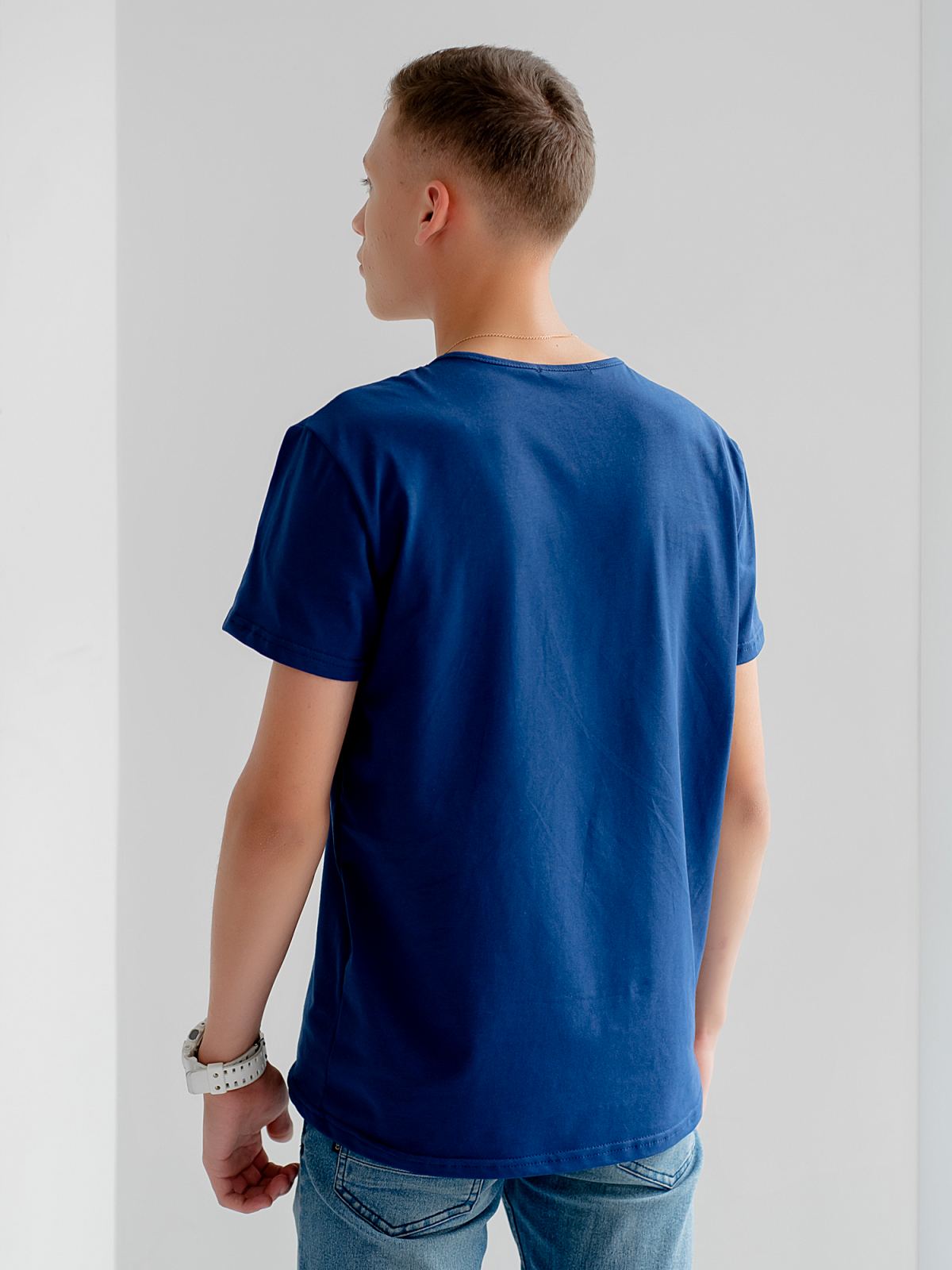 Футболка мужская из кулирки синего(индиго) цвета свободного силуэта с короткими рукавами,круглая горловина обработана бейкой. Изделие выполнено из трикотажа премиального качества - ПЕНЬЕ, с содержанием хлопка более 95%