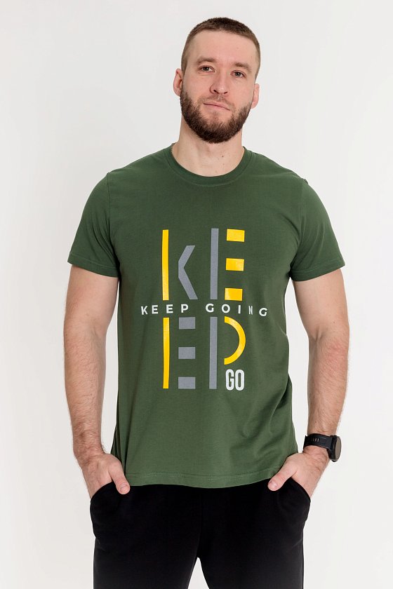 Футболка мужская, выполнена из однотонной хлопковой ткани. Свободного кроя, короткий рукав. Горловина с круглым вырезом, отделанным планкой. Спереди нанесён принт.