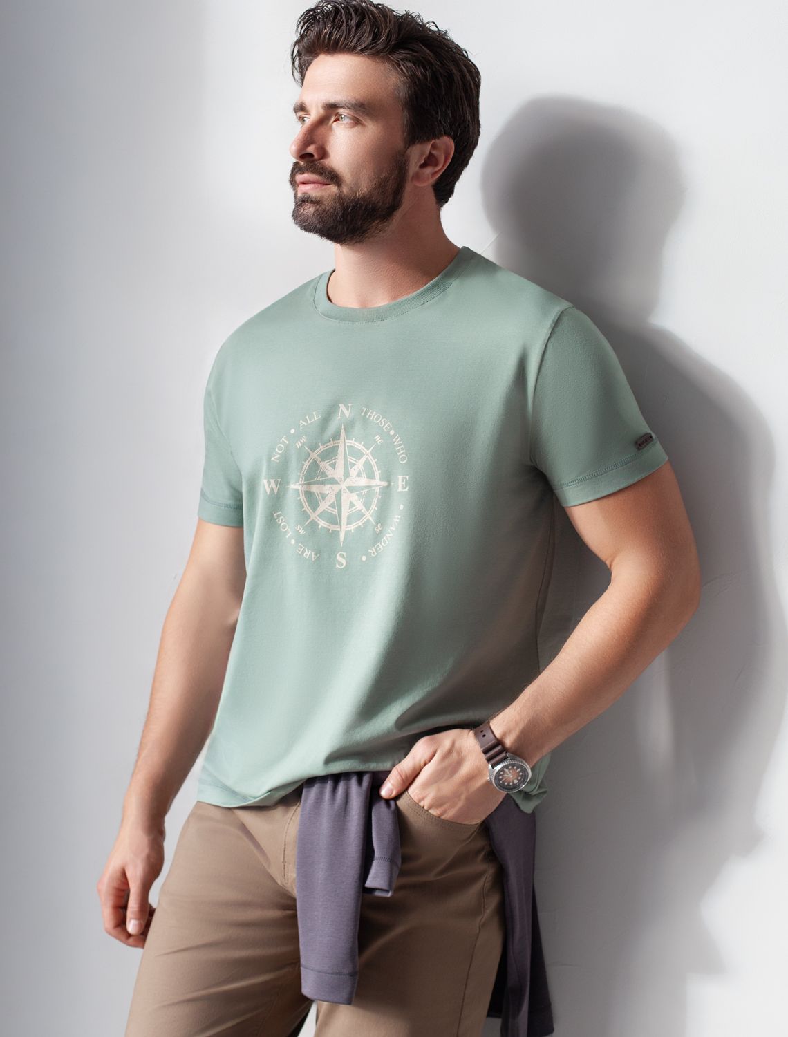 Базовая футболка светло-оливкового цвета из премиального хлопка с эластаном полуприлегающего кроя станет универсальным решением для любого случая. Прямой крой обеспечивает комфортную посадку на любую фигуру, включая большие размеры, подходит как на низкий, так и на высокий рост. Выполненная из натуральной ткани, она обладает дышащими свойствами, а за счет эластичности сохраняет форму даже после длительного ношения и многочисленных сирок. Однотонная футболка выполнена в минималистичном стиле, дополнена принтом в виде изображения компаса и надписи. Перевод надписи: Not all those who wander are lost - Не все те, кто странствует, потеряны. На рукаве нашивка из эко-кожи с логотипом VILATTE. Подходит как классический вариант для работы в офис, так и для повседневной носки или занятий спортом. Мягкая ткань приятна к телу, не вызывает дискомфорта и идеально подходит для дома или летних прогулок благодаря короткому рукаву. Простая и практичная футболка станет базовым элементом вашего гардероба. Она легко сочетается в спортивном или классическом стиле. Стрейч-ткань поддерживает свободу движений и подчеркивает индивидуальный стиль каждого мужчины. св.оливковый_wander