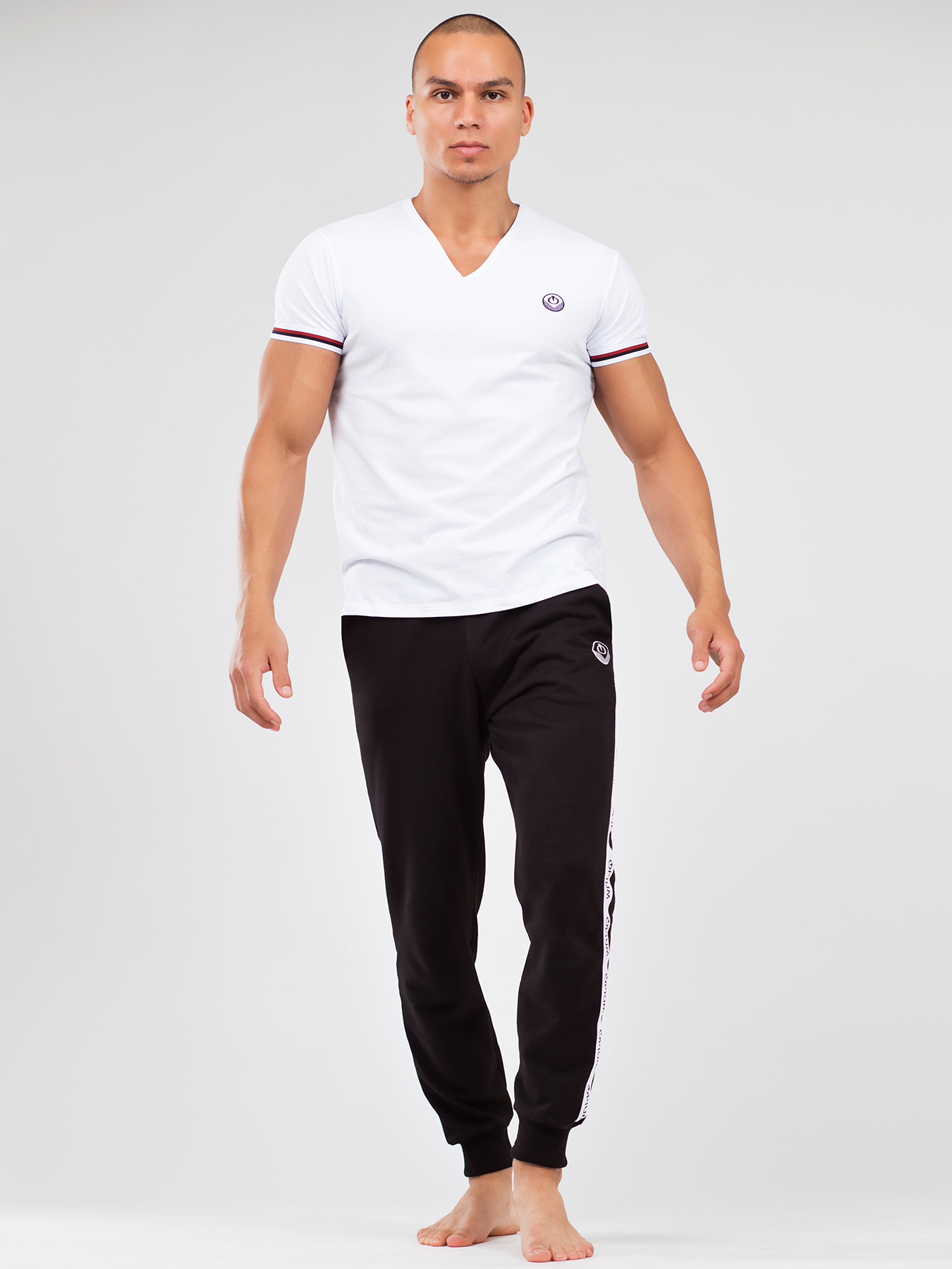Мужская белая футболка в спортивном стиле из хлопка с эластаном. V-образный вырез горловины подчёркивает мужской торс и подходит к любому типу телосложения. Оригинальные детали: полосатая резинка по краю рукавов, вышивка-шеврон в виде фирменного логотипа, - особенности этой привлекательной модели.