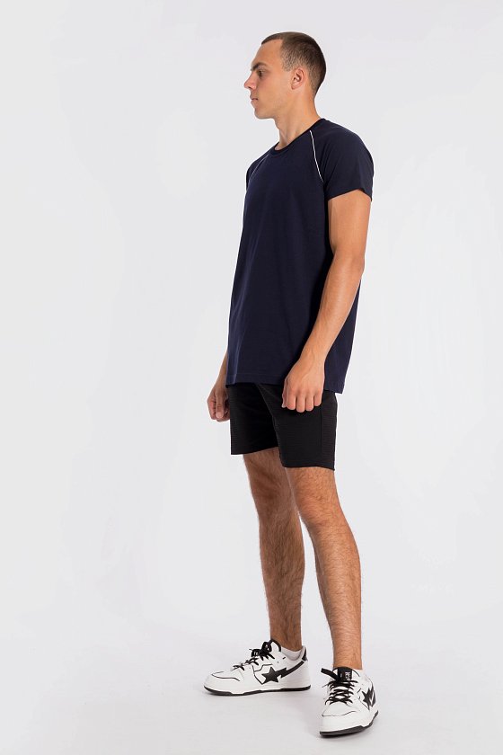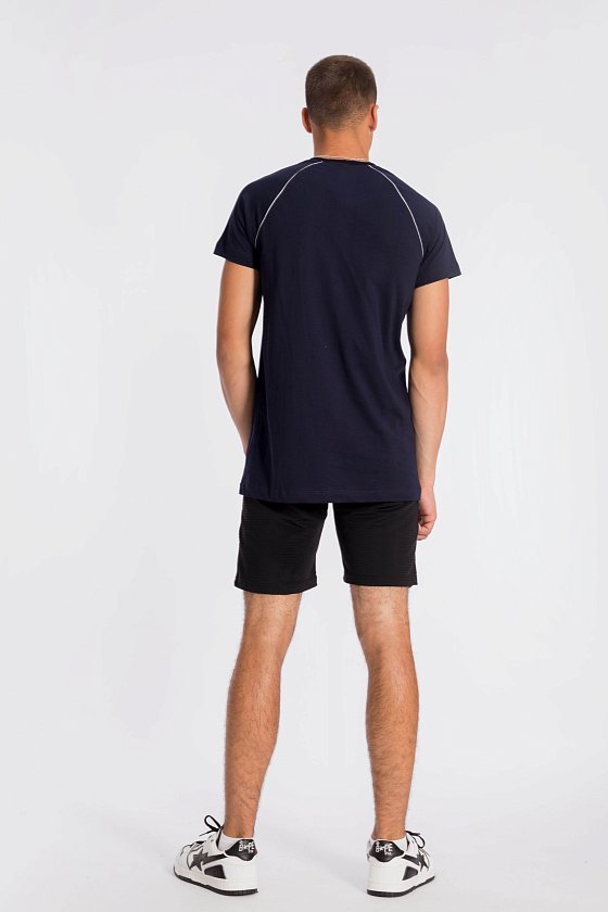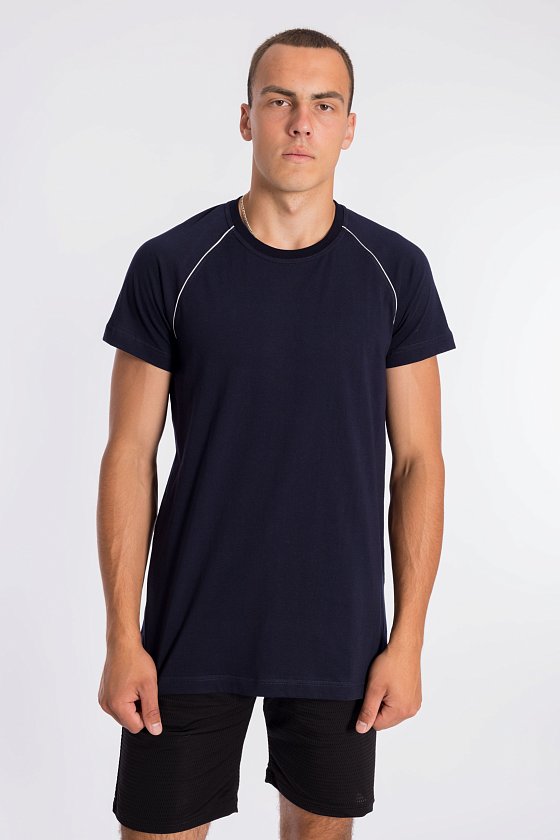 Мужская футболка выполнена из хлопкового полотна. Горловина имеет круглый вырез, рукава покроя реглан отделаны кантом.