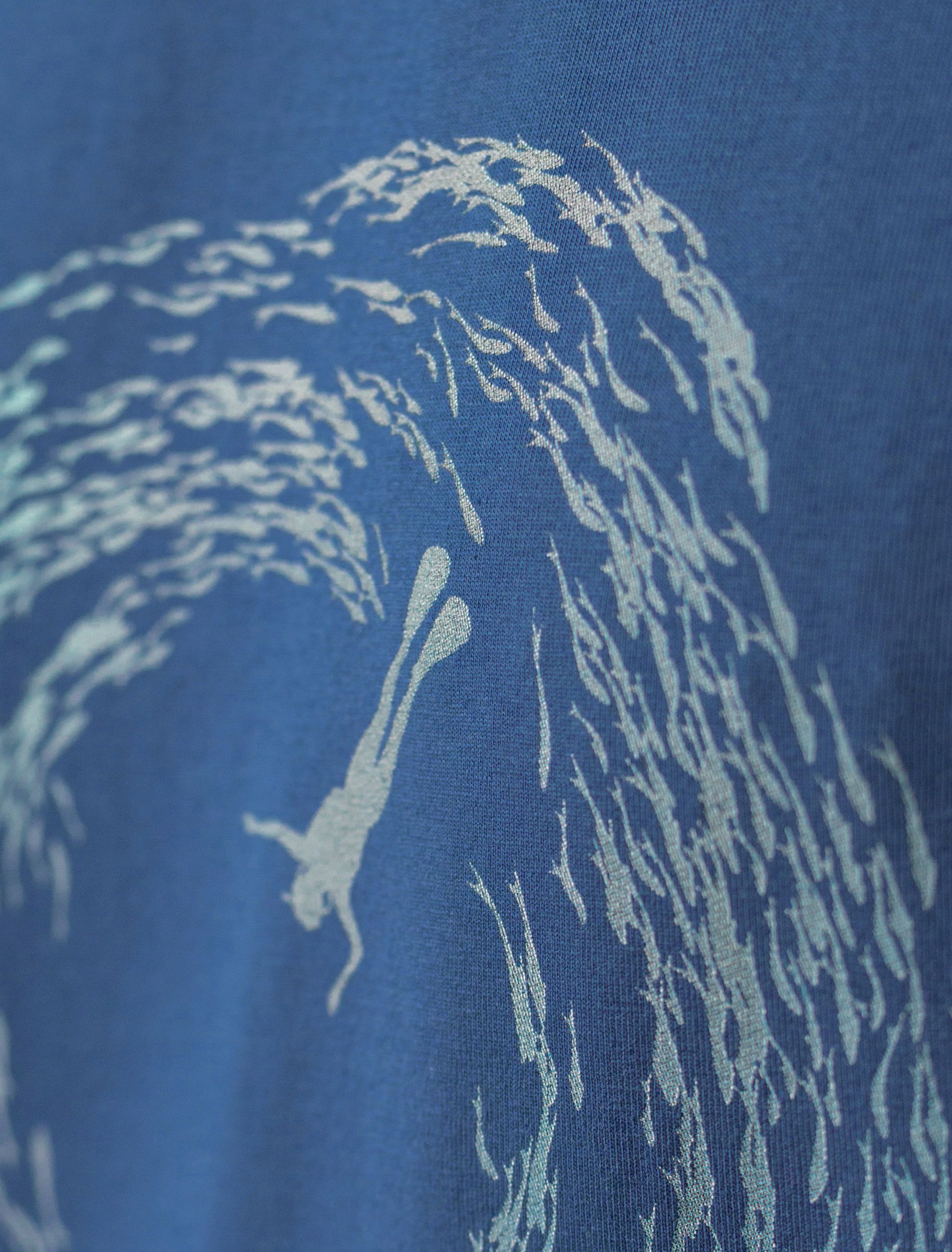 Футболка выполнена из премиального хлопка с эластаном. Авторский принт нанесен фактурными красками с устойчивым покрытием. Изделие комфортно сидит по фигуре, не сковывая движений. За счет среднего объема, хорошо подойдет как первый слой под пиджак, кардиган или бомбер. На рукаве нашивка из эко-кожи с логотипом бренда. т.синий_ocean