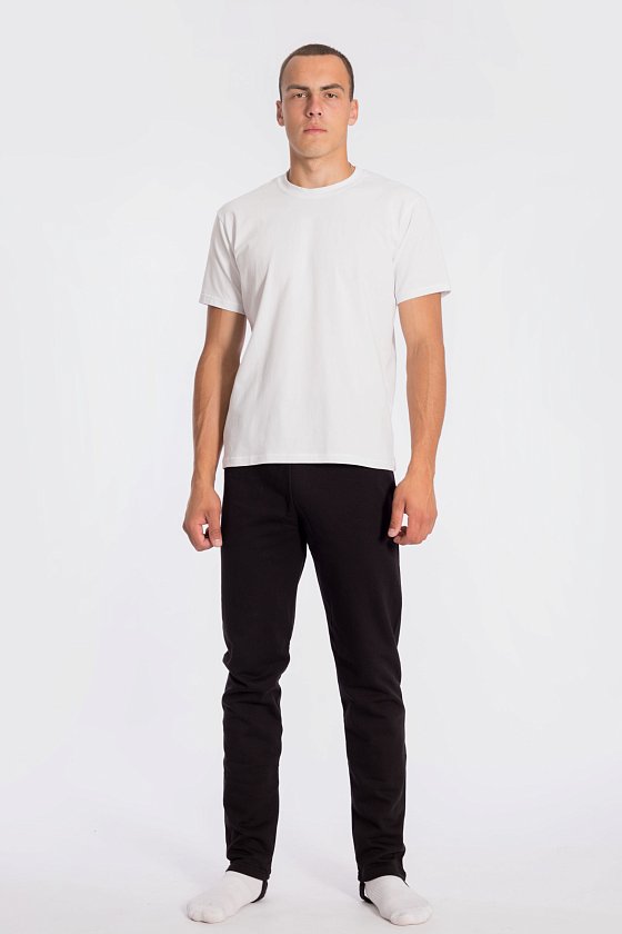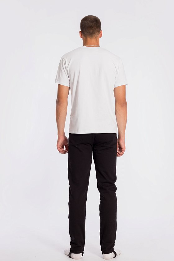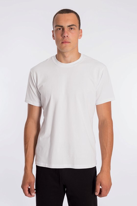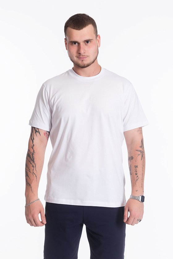 Мужская футболка свободного силуэта выполнена из однотонного х/б полотна с лайкрой. Рукав короткий, втачной, горловина имеет круглый вырез.