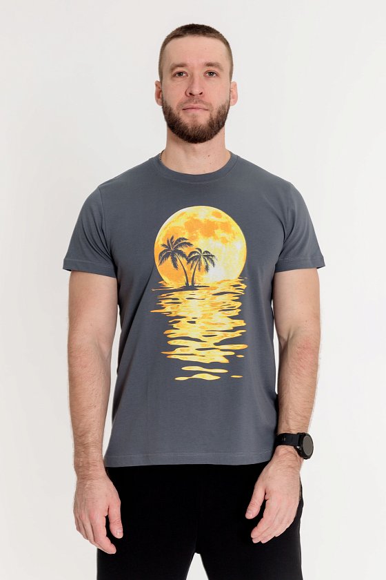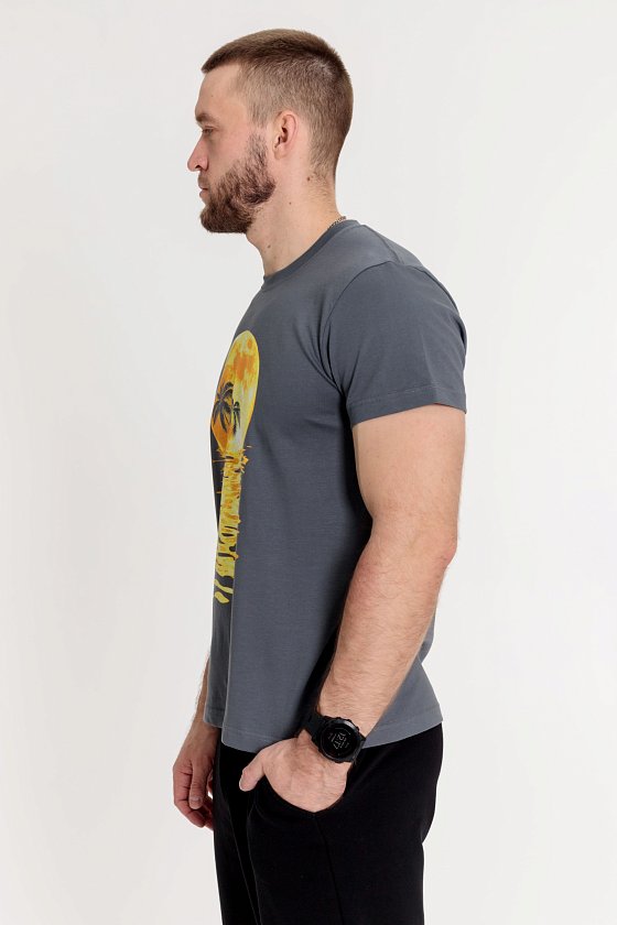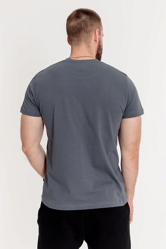 Футболка мужская, выполнена из однотонной хлопковой ткани. Свободного кроя, короткий рукав. Горловина с круглым вырезом, отделанным планкой. Спереди нанесён принт.