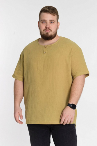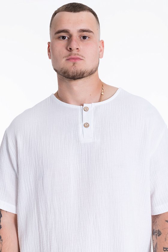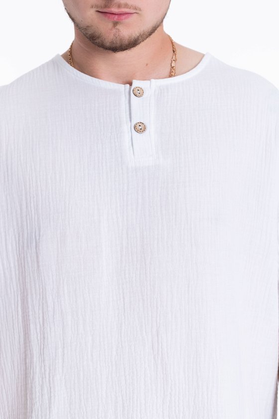 Мужская футболка выполнена из хлопкового полотна - муслина. Силуэт футболки свободный, линия плеча спущена. Круглый вырез горловины с застёжкой на две пуговицы, низ футболки разноуровневый.