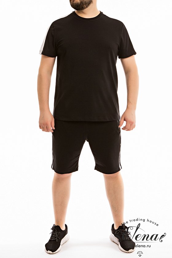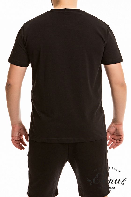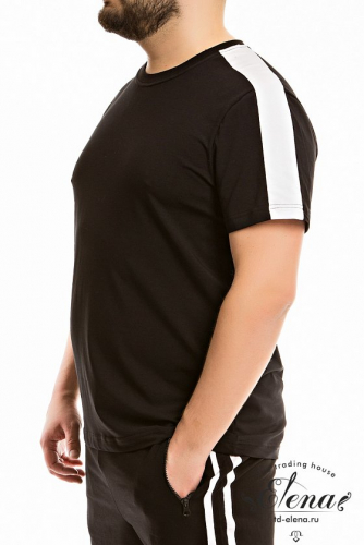 Мужская футболка выполнена из кулирки с лайкрой. В плечевой части широкая отделочная полоса. Футболка с коротким рукавом и круглым вырезом горловины с притачной планкой из рибаны.