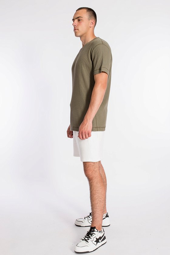 Мужская футболка выполнена из интерлочного полотна с фактурой "вафля". С коротким рукавом и круглым вырезом горловины.