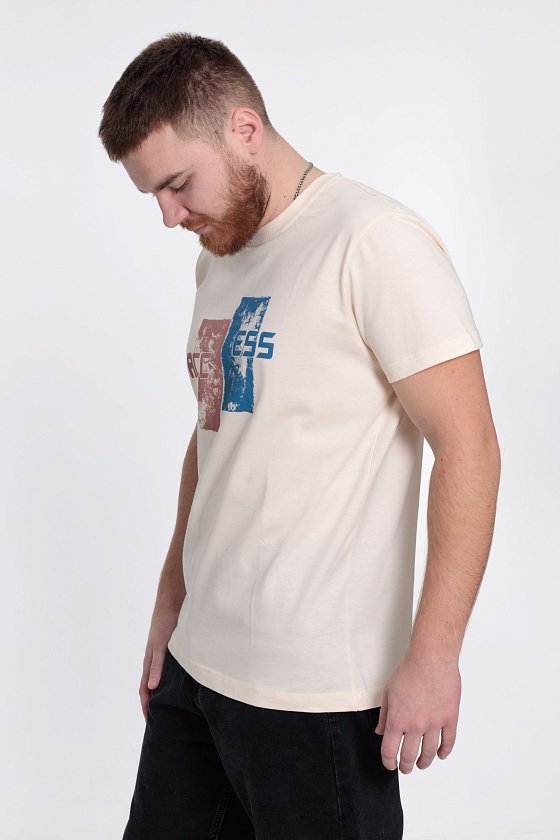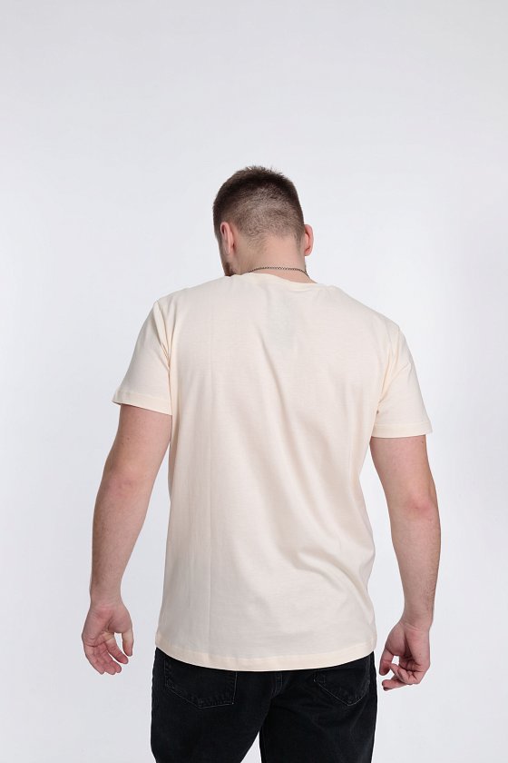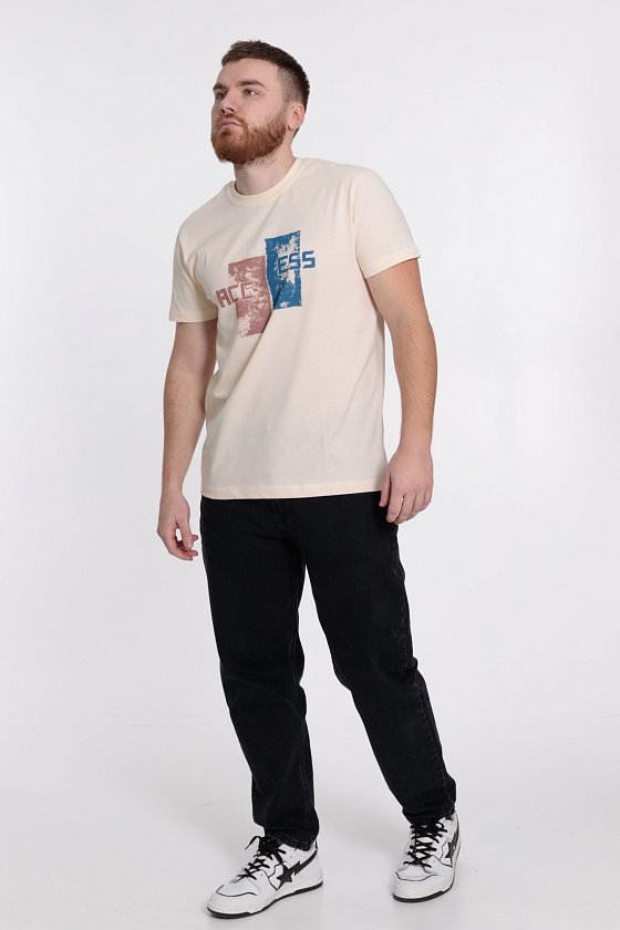 Футболка мужская, выполнена из однотонной хлопковой ткани. Свободного кроя, короткий рукав. Горловина с круглым вырезом, отделанным планкой. Спереди нанесён принт.