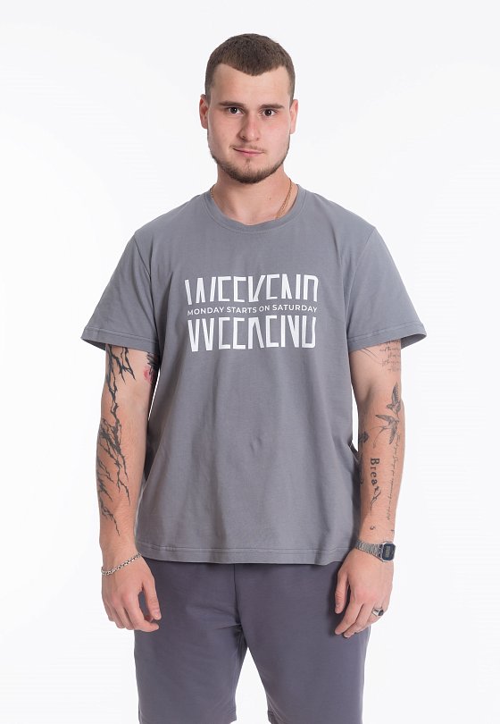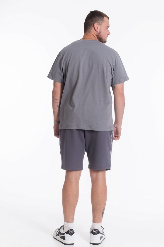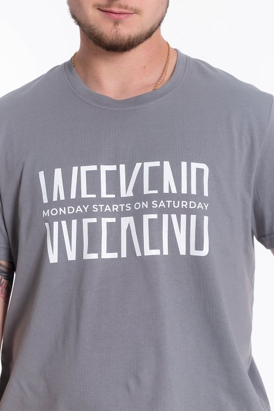 Футболка свободного силуэта из однотонного х/б полотна с коротким рукавом, круглый вырез горловины оформлен планкой. Спереди нанесён принт.