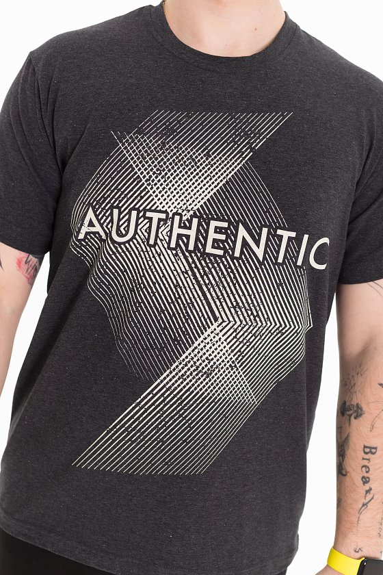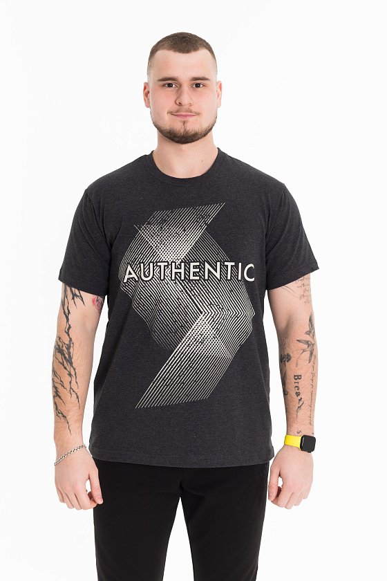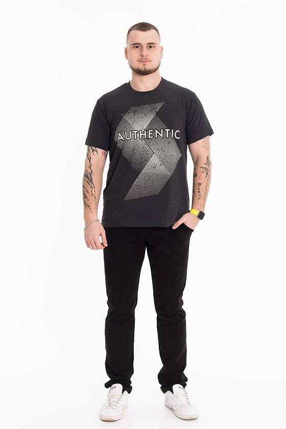 Футболка мужская, выполнена из однотонной хлопковой ткани с добавлением лайкры. Свободного кроя, короткий рукав. Горловина с круглым вырезом, отделанным планкой. Спереди нанесён принт.