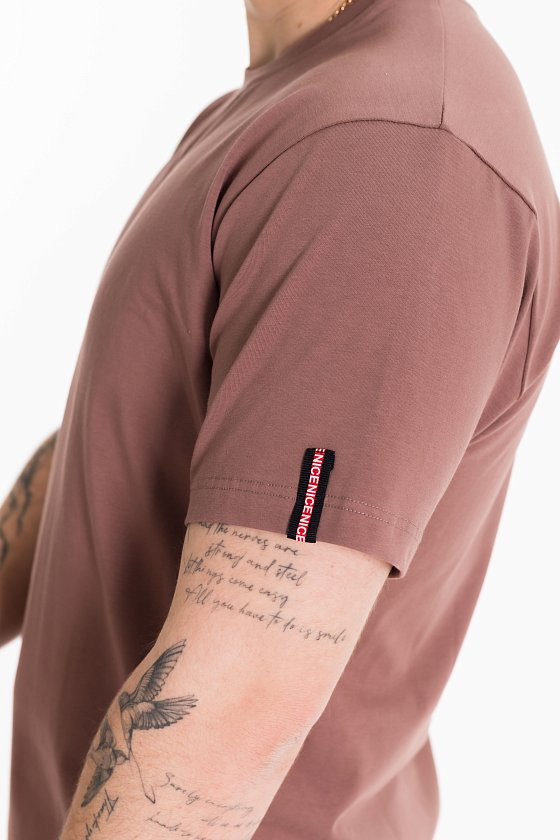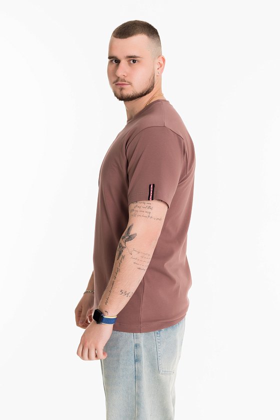 Мужская футболка выполнена из хлопкового полотна с лайкрой. Футболка с коротким рукавом и круглым вырезом горловины. Слева на рукаве расположена декоративная лента.