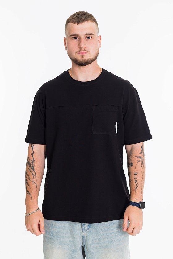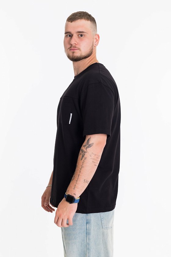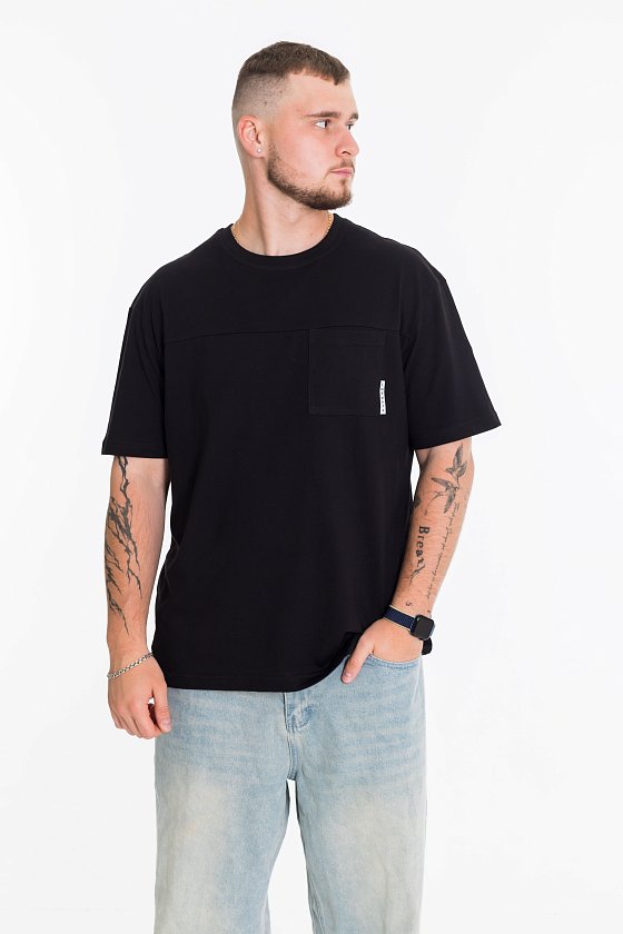 Мужская футболка выполнена из однотонной кулирки. Футболка с коротким рукавом и круглым вырезом горловины. В качестве декора с левой стороны размещен накладной карман с флажком.