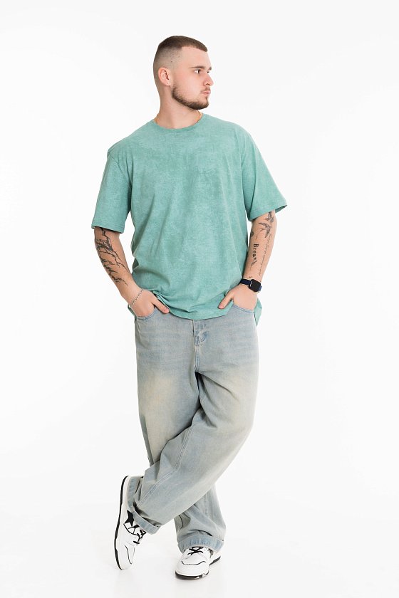 Мужская футболка из лёгкой и приятной к телу ткани — отличный выбор для повседневного гардероба. Изготовлена из кулирки цвета "ментол", имеет свободный силуэт и круглый вырез горловины. Футболка идеально подойдёт для отдыха или домашней носки.
