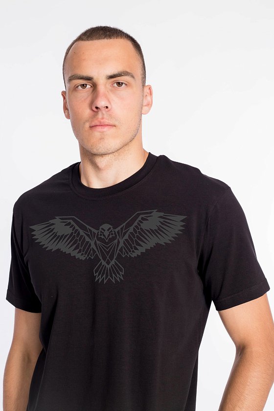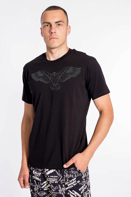 Мужская футболка с принтом свободного силуэта выполнена из однотонного х/б полотна с лайкрой. Рукав короткий, втачной, горловина имеет круглый вырез.