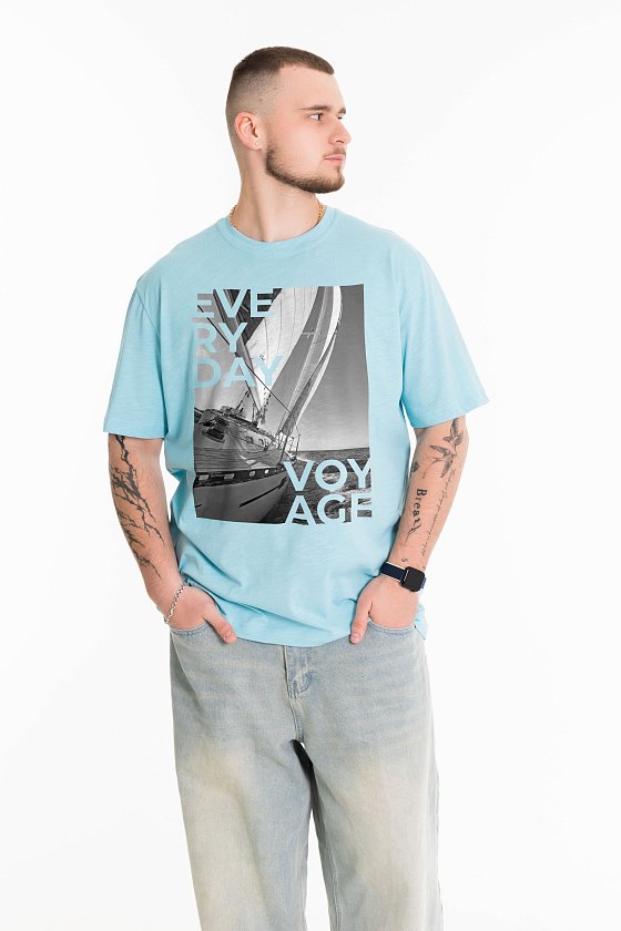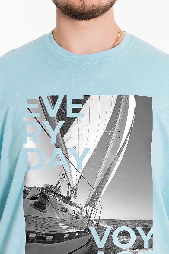 Мужская футболка с принтом спереди изготовлена из хлопкового полотна - кулирка "фламли", что обеспечивает комфорт и хорошую воздухопроницаемость. Футболка имеет короткий рукав и круглый вырез горловины. Изготовленная из натуральной ткани, футболка обеспечит комфорт в течение всего дня.