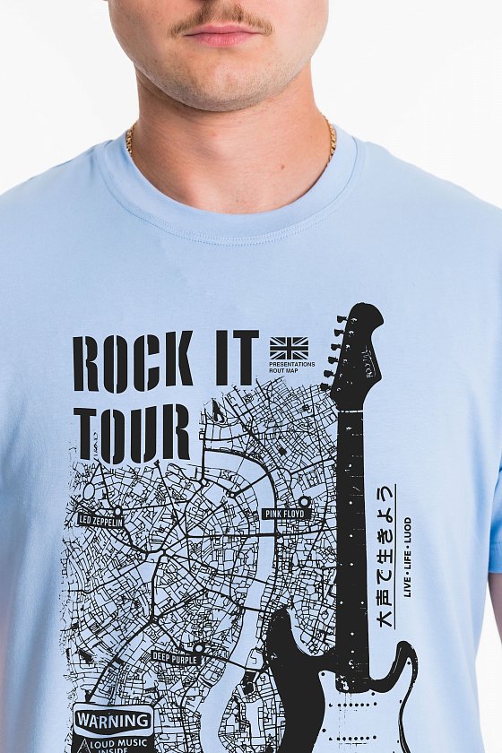 Мужская футболка с принтом изготовлена из хлопкового полотна с добавлением лайкры, что обеспечивает комфорт и хорошую воздухопроницаемость. Футболка имеет короткий рукав и круглый вырез горловины, что придает ей классический стильный вид. Изготовленная из натуральной ткани, футболка обеспечит комфорт в течение всего дня.