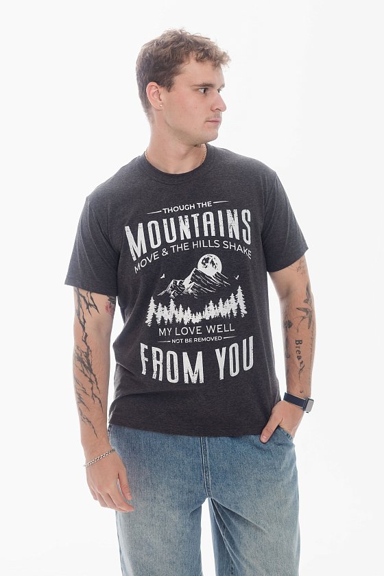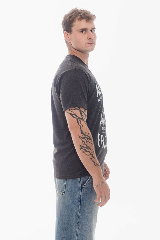 Футболка мужская, выполнена из однотонной хлопковой ткани с добавлением лайкры. Футболка с коротким рукавом и горловиной с круглым вырезом, отделанной планкой. Спереди нанесён принт.