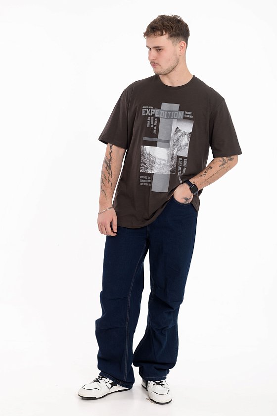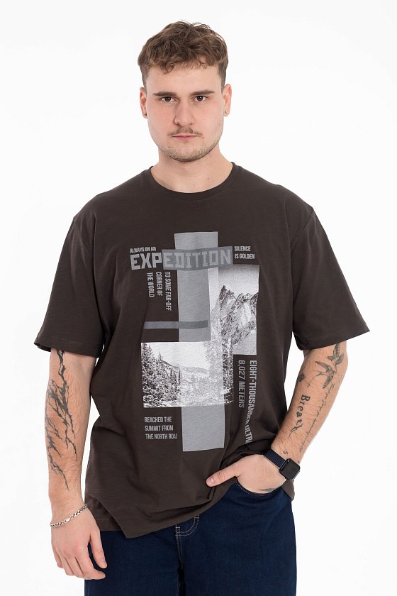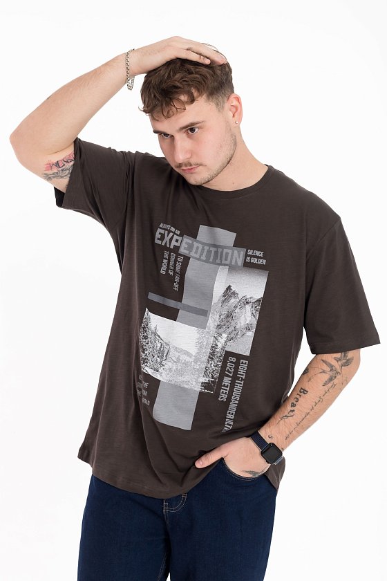 Мужская футболка с принтом изготовлена из хлопкового полотна - кулирки "фламли", что обеспечивает комфорт и хорошую воздухопроницаемость. Футболка имеет короткий рукав и круглый вырез горловины, что придает ей классический стильный вид. Такая модель футболки отлично сочетается с джинсами или брюками. Изготовленная из натуральной ткани, футболка обеспечит комфорт в течение всего дня.