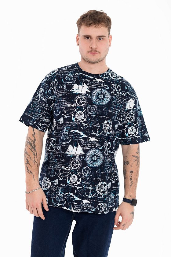 Мужская футболка выполнена из мягкого хлопкового полотна с набивным рисунком. Модель имеет прямой крой и слегка спущенный рукав, который обеспечивает комфортную посадку и современный силуэт. Круглая горловина оформлена в классическом варианте, что делает футболку универсальной и подходящей для повседневных образов. Легкая, удобная и практичная — она станет удачным выбором для ежедневной носки.