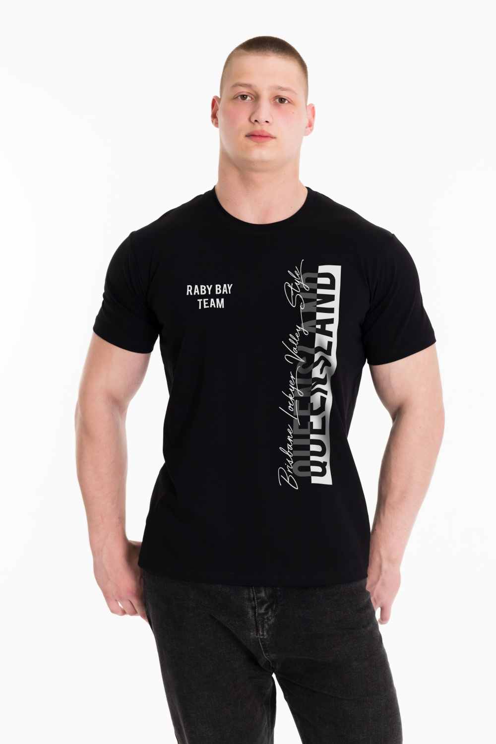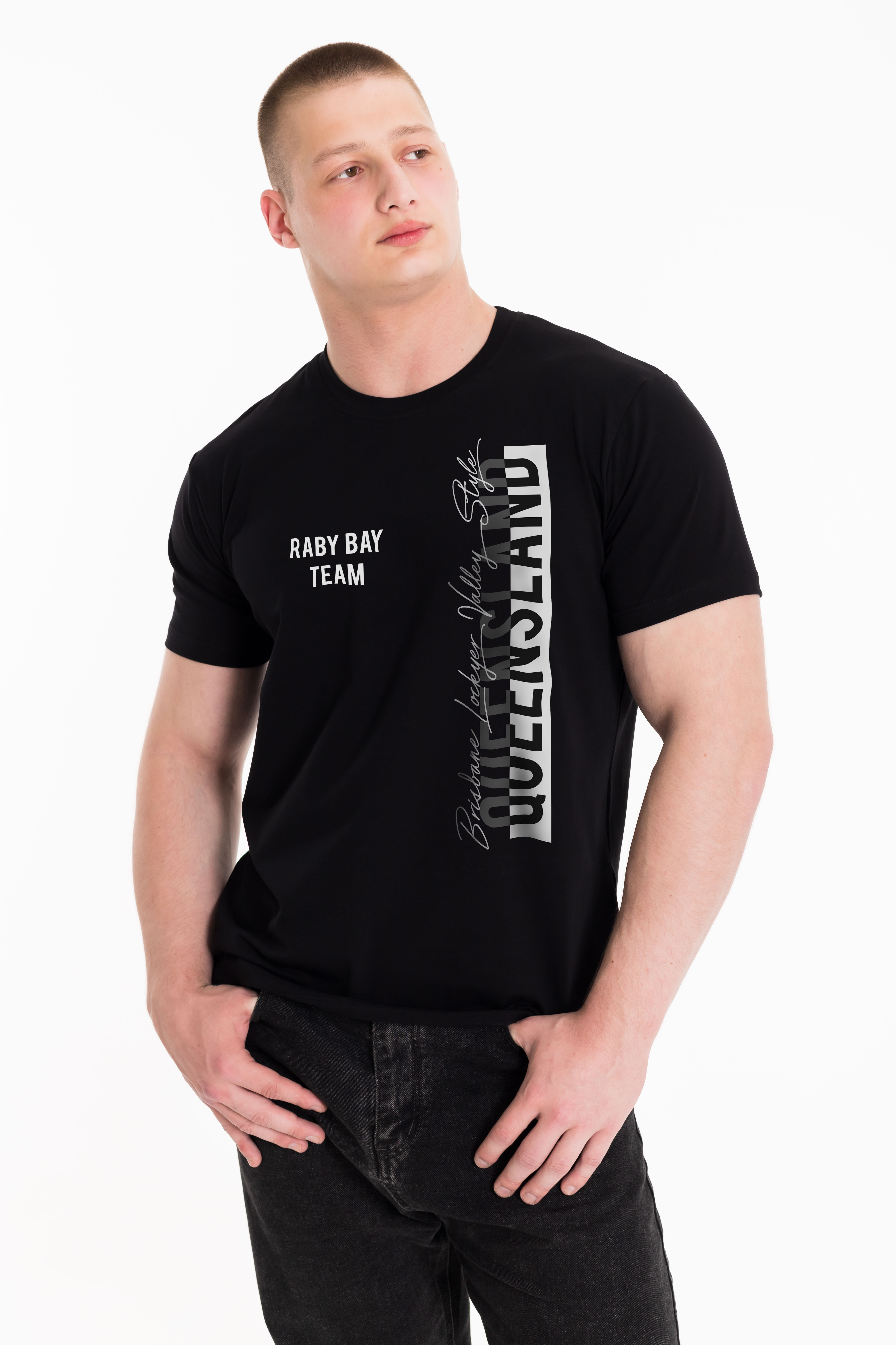 Мужская футболка свободного силуэта выполнена из однотонного х/б полотна с лайкрой. Рукав короткий, втачной, горловина имеет круглый вырез. На полочке расположен оригинальный принт. Хлопок 95% Лайкра 5%