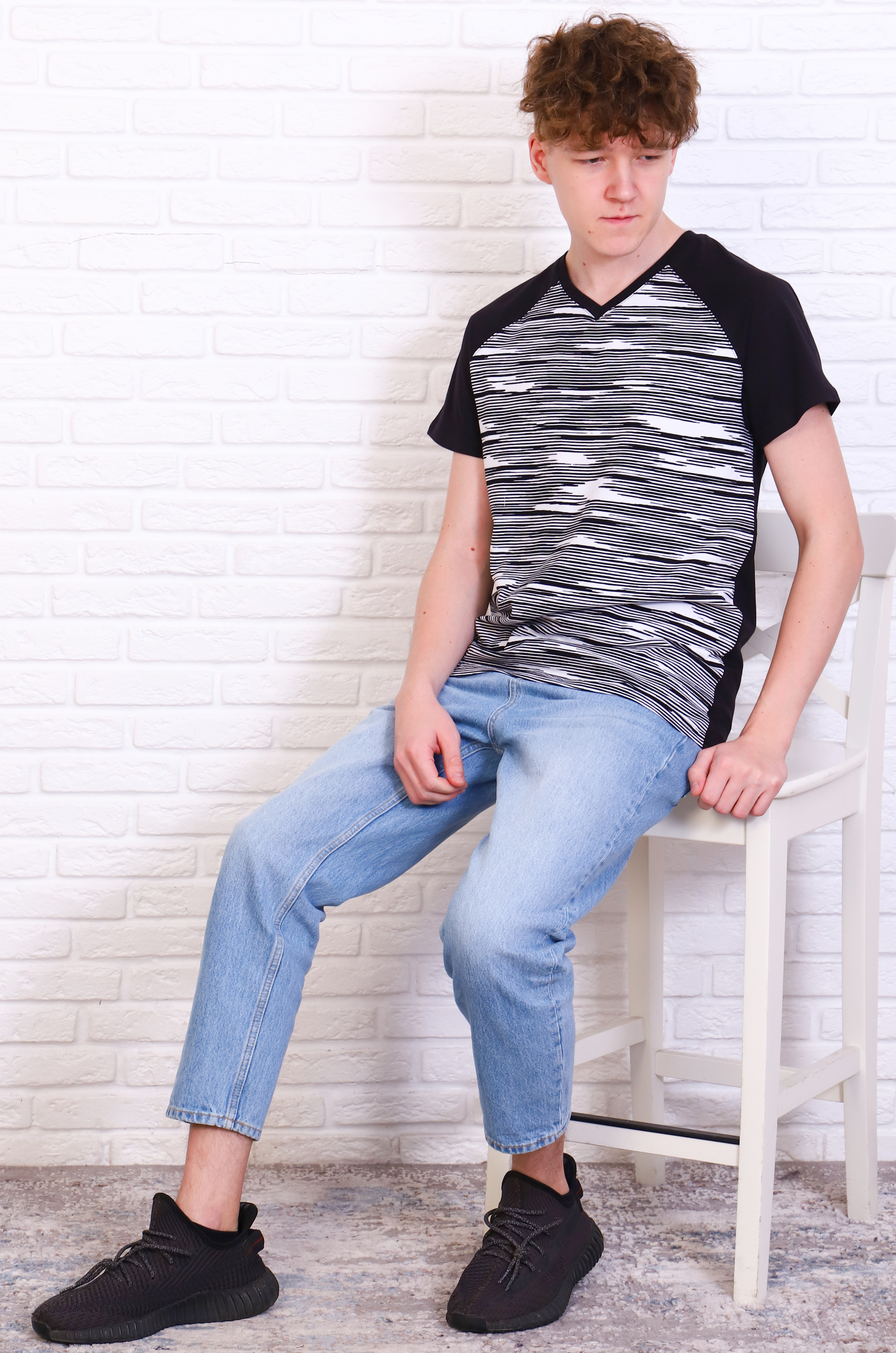 Мужская комбинированная футболка прямого кроя, рукав-реглан, V-образный вырез горловины обработан эластичной рибаной.