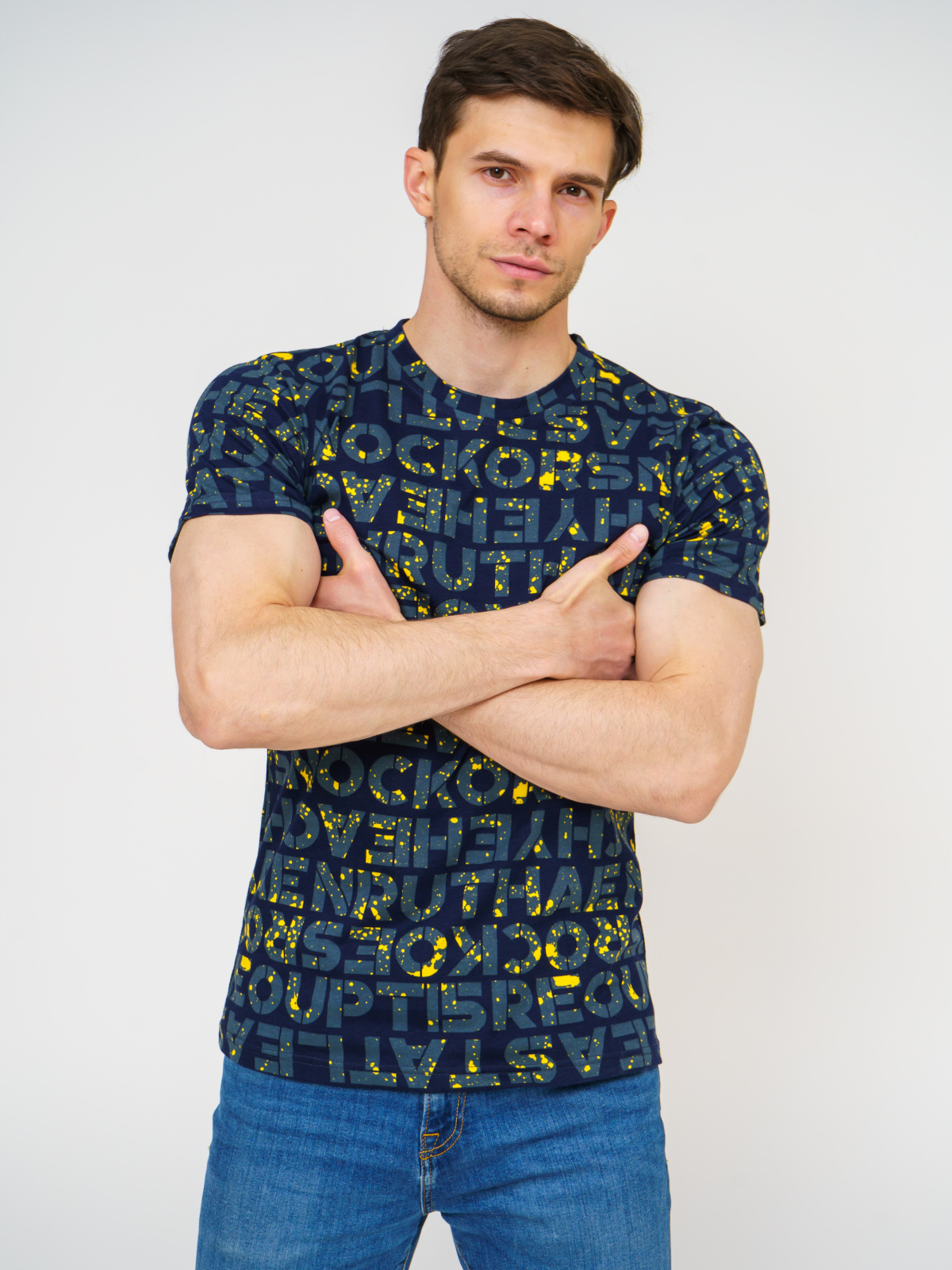 Футболка будет эффектно смотреться как с брюками, так и с джинсами, за счет универсальной длины хорошо сидит на любых типах фигуры. Представлена в темно-синем цвете с яркими желтыми акцентами. Мягкий хлопковый трикотаж комфортен в носке при любых условиях. Может использоваться в качестве повседневной одежды, идеально подходит для любых тренировок.