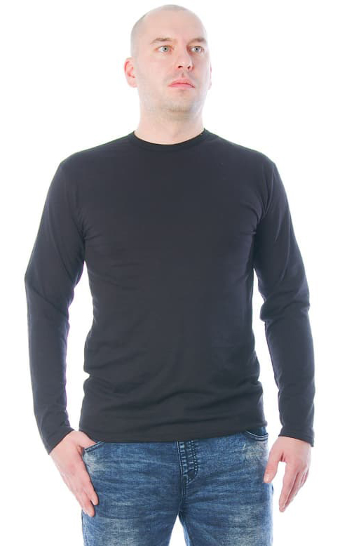 Футболка мужская однотонная с длинным рукавом, классический (прямой) покрой. В изготовлении футболок, используется трикотажное кулирное полотно, состоящее из 100% хлопка, плотностью 150-160  г/м2. Промзводство Узбекистан