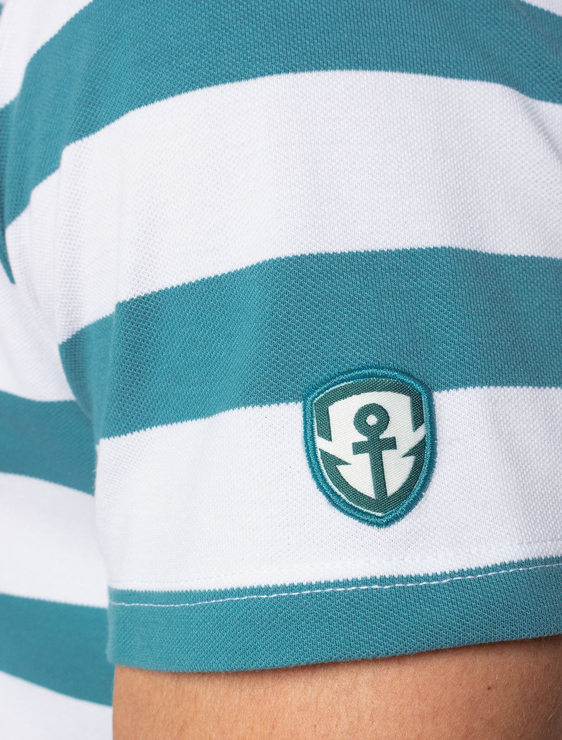Футболка-поло выполнена из фактурного трикотажа. Модель дополнена принтом-нашивкой в морской стилистике и фирменным логотипом бренда из эко-кожи. Премиальный хлопок с эластаном обеспечивает абсолютный комфорт и сохраняет безупречный внешний вид в течении долгого времени. Материал хорошо пропускает воздух, и поддерживает оптимальный микроклимат в жаркую погоду. морская волна-белый