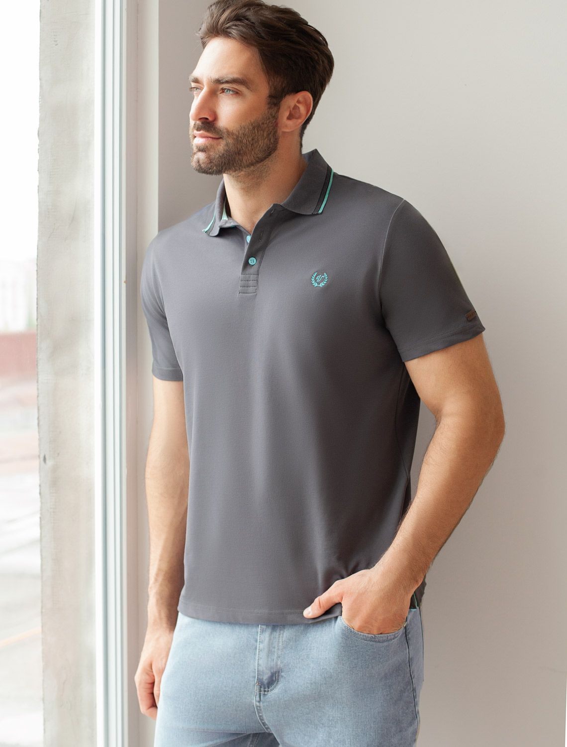Футболка-поло из фактурного трикотажа U49.012 т.серый