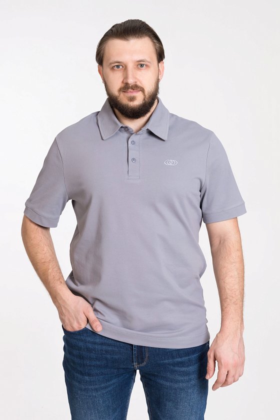 Футболка-поло выполнена из однотонного пике серого цвета. Футболка с воротником-стойкой, коротким втачным рукавом на узкой манжете и застежкой на пуговицы. С левой стороны вышивка фирменного логотипа в цвет поло.
