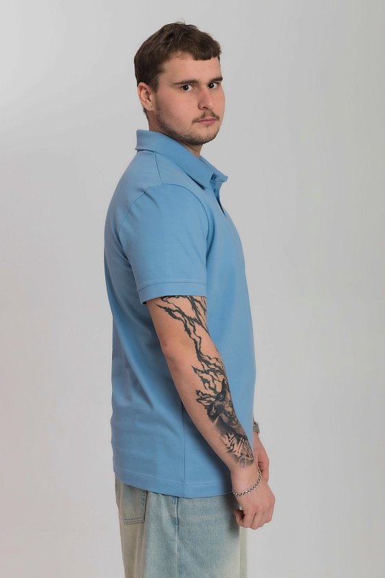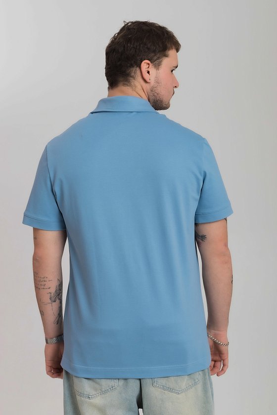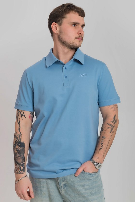 Футболка-поло выполнена из однотонного пике голубого цвета. Футболка с воротником-стойкой, коротким втачным рукавом на узкой манжете и застежкой на пуговицы. С левой стороны вышивка фирменного логотипа в цвет поло.