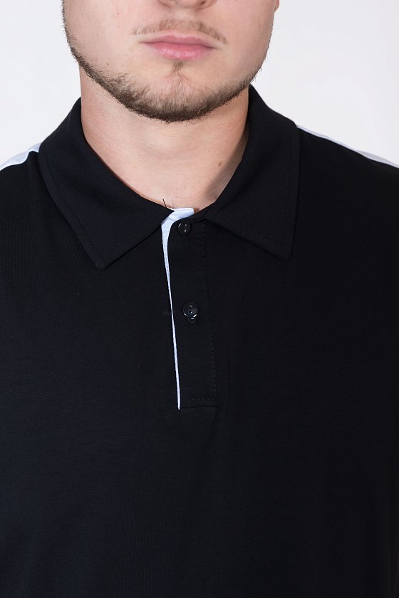 Футболка-поло - ворот с застежкой на пуговицы. Середина плеча и низ рукавово обработаны вставками контрастного цвета.