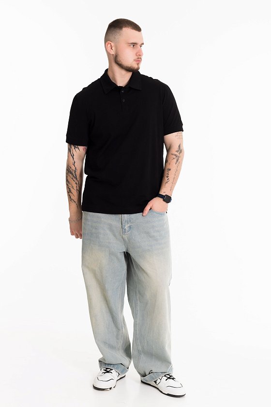 Футболка-поло из однотонного хлопкового полотна с добавлением лайкры. Втачной короткий рукав на манжете, воротник на отрезной стойке с застежкой на три пуговицы.