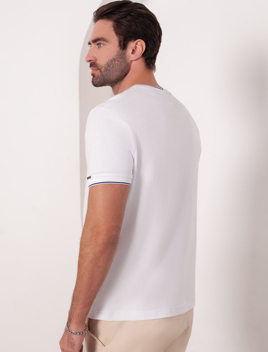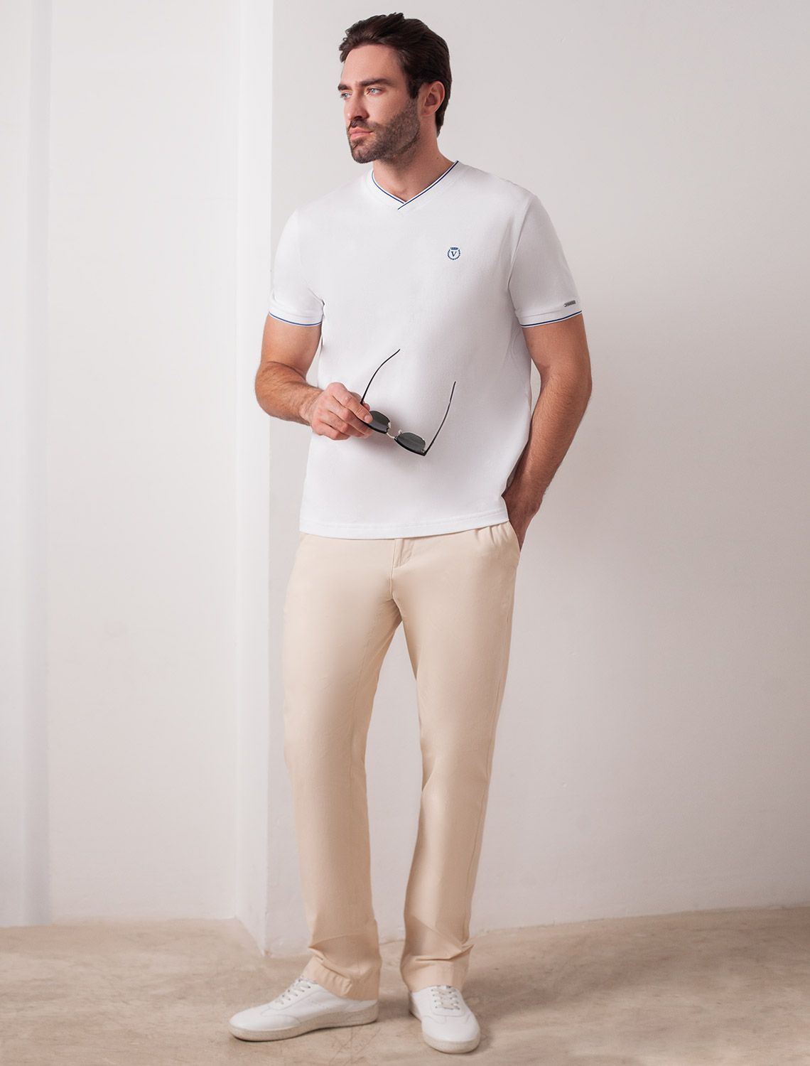 Футболка белого цвета с аккуратным V-образным вырезом выполнена из премиального хлопка с эластаном плотностью 200 Г/м2. Высококачественный эластичный хлопок обеспечивает мягкость, воздухопроницаемость и идеальную посадку на любую фигуру и размеры, включая 58 размер. Классический прямой крой футболки подчеркивает фигуру, но не сковывает движений. Элегантный небольшой V-образный вырез с контрастной полосой визуально удлиняет шею, а минималистичная вышивка на груди в виде логотипа бренда добавляет изысканности и индивидуальности, не перегружая образ. Эта базовая футболка - идеальный баланс комфорта и стиля для современного мужчины, легко сочетается с разными низами, создавая образ от кэжуал до более элегантного. Стильная футболка подходит как для повседневной носки, так и для создания более нарядных образов.