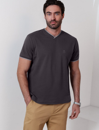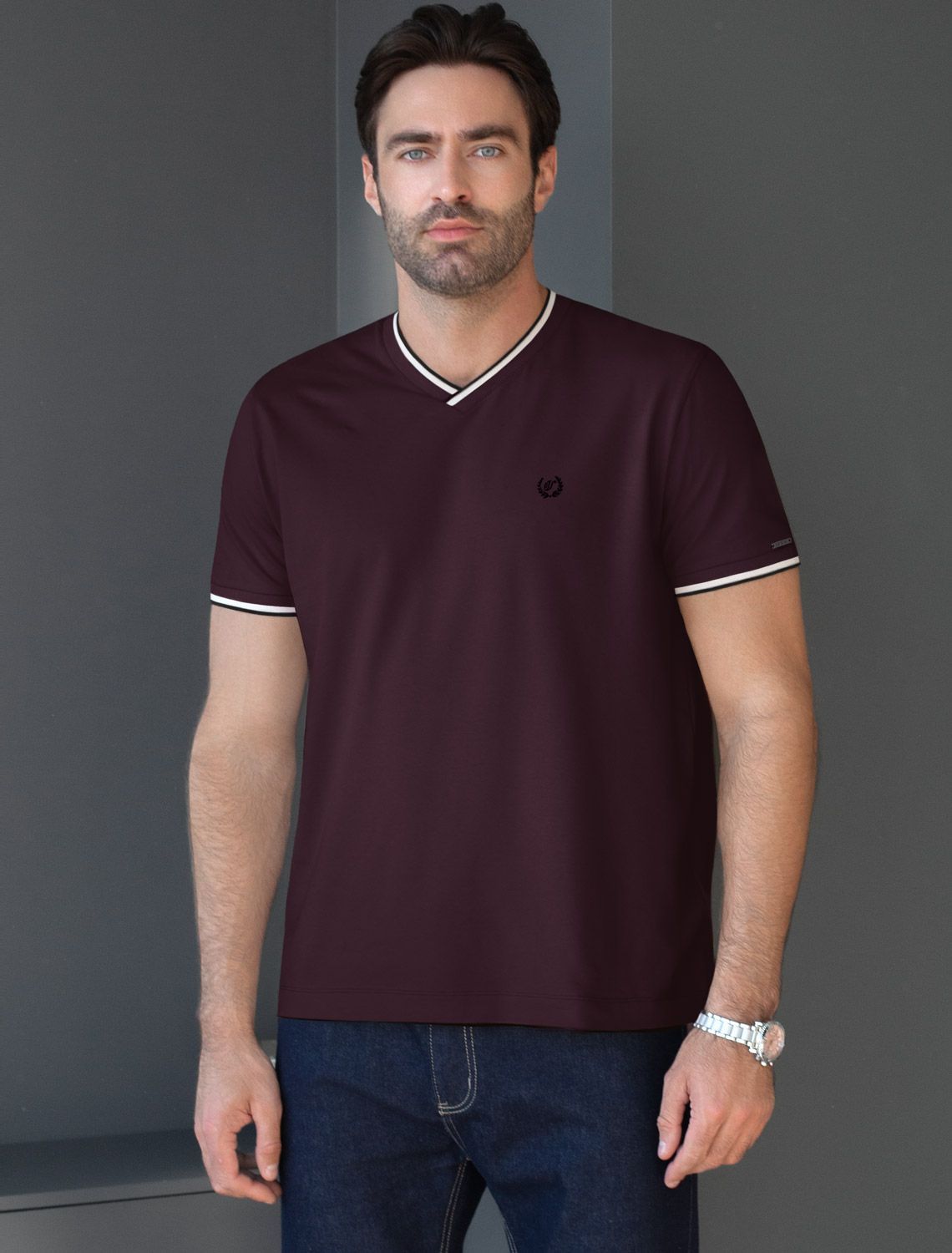Футболка цвета бургунди с аккуратным V-образным вырезом выполнена из премиального хлопка с эластаном плотностью 200 Г/м2. Высококачественный эластичный хлопок обеспечивает мягкость, воздухопроницаемость и идеальную посадку на любую фигуру и размеры, включая 58 размер. Классический прямой крой футболки подчеркивает фигуру, но не сковывает движений. Элегантный небольшой V-образный вырез с контрастной полосой визуально удлиняет шею, а минималистичная вышивка на груди в виде логотипа бренда добавляет изысканности и индивидуальности, не перегружая образ. Эта базовая футболка - идеальный баланс комфорта и стиля для современного мужчины, легко сочетается с разными низами, создавая образ от кэжуал до более элегантного. Стильная футболка подходит как для повседневной носки, так и для создания более нарядных образов.