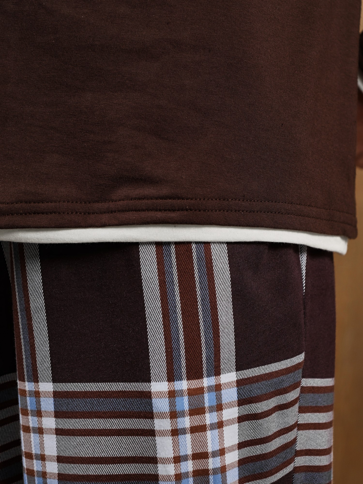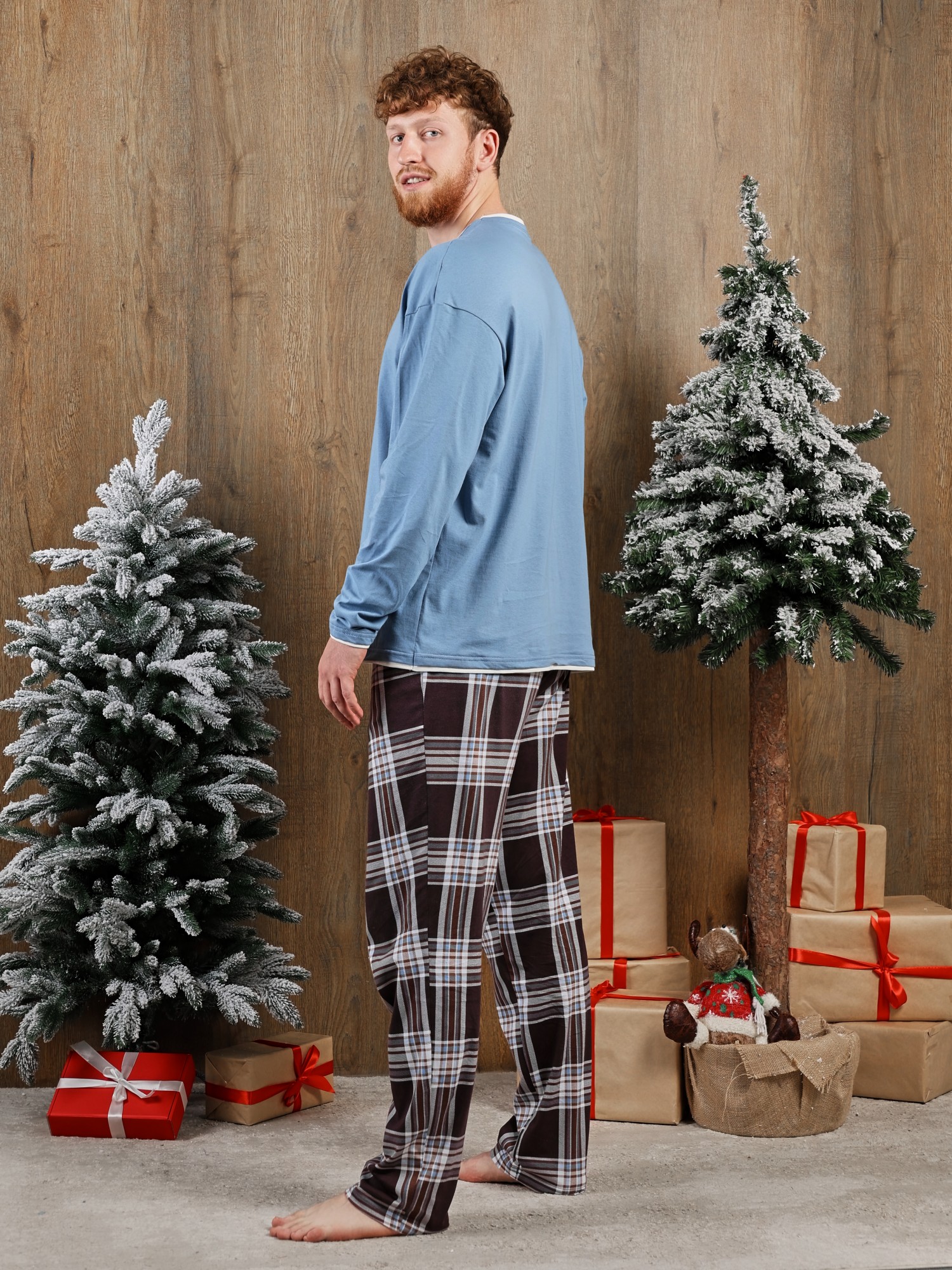 Костюм мужской из трикотажного полотна "кулирка" в комбинации двух видов: гладкокрашенного и с рисунком в крупную клетку, сочетающихся между собой по цвету, состоящий из джемпера и брюк. Джемпер - из гладкокрашеного полотна, свободного покроя, с длинными втачными рукавами и приспущенными плечами, с горловиной овальной формы и тематическим принтом, выполненным в технике шелкографии. Горловина, нижние срезы рукавов и низ изделия обработаны подгибкой с отделочным широким кантом контрастного цвета. Брюки - из полотна в клетку, свободного покроя, прямые, на притачном поясе с эластичной тесьмой внутри, с карманами в боковых швах. Нижние срезы обработаны подгибкой.