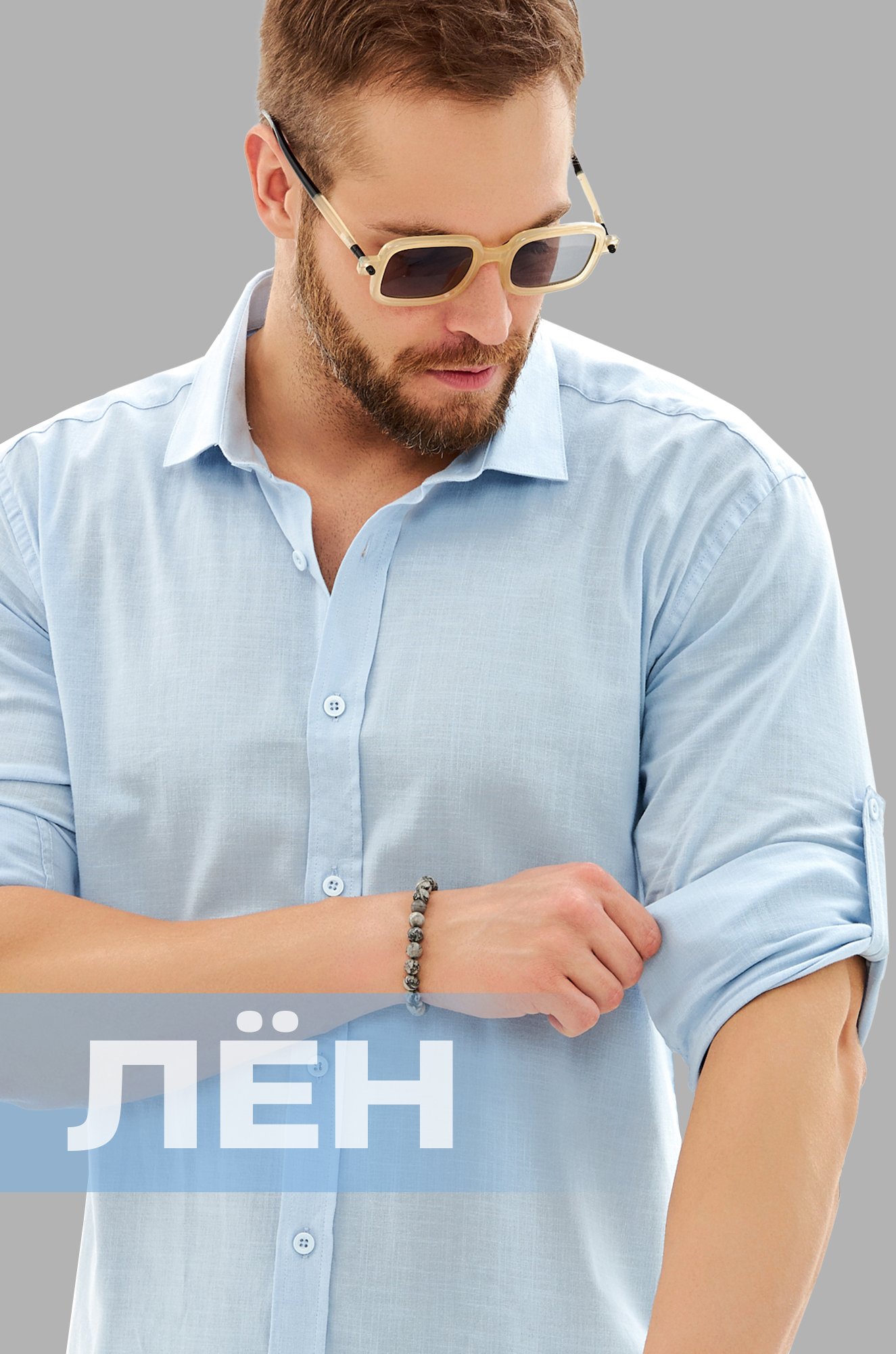 *замеры выборочные, могут незначительно отличаться. овторимая! Приталенная мужская рубашка выполнена из хлопка и льна – идеальный вариант для кэжуал-образов!Базовый голубой цвет, застежка на классические пуговицы и отложной воротник превратят каждый образ в брутальный и лаконичный. Длинные рукава можно легко регулировать с помощью застёжки — адаптируй образ под погоду и настроение.Благодаря лайкре в составе хлопковая рубашка прочная и сохраняет форму даже после частых стирок.Однотонная рубашка подойдет для офиса, учебы и официальных мероприятий. Льняная сорочка для мужчин станет крутой базой на каждый день. В классической голубой рубашке будь безупречен в любой ситуации! Рост модели 188 см, параметры: объем груди 112, объем талии 86, объем бедер 102 см. На нем размер 54.