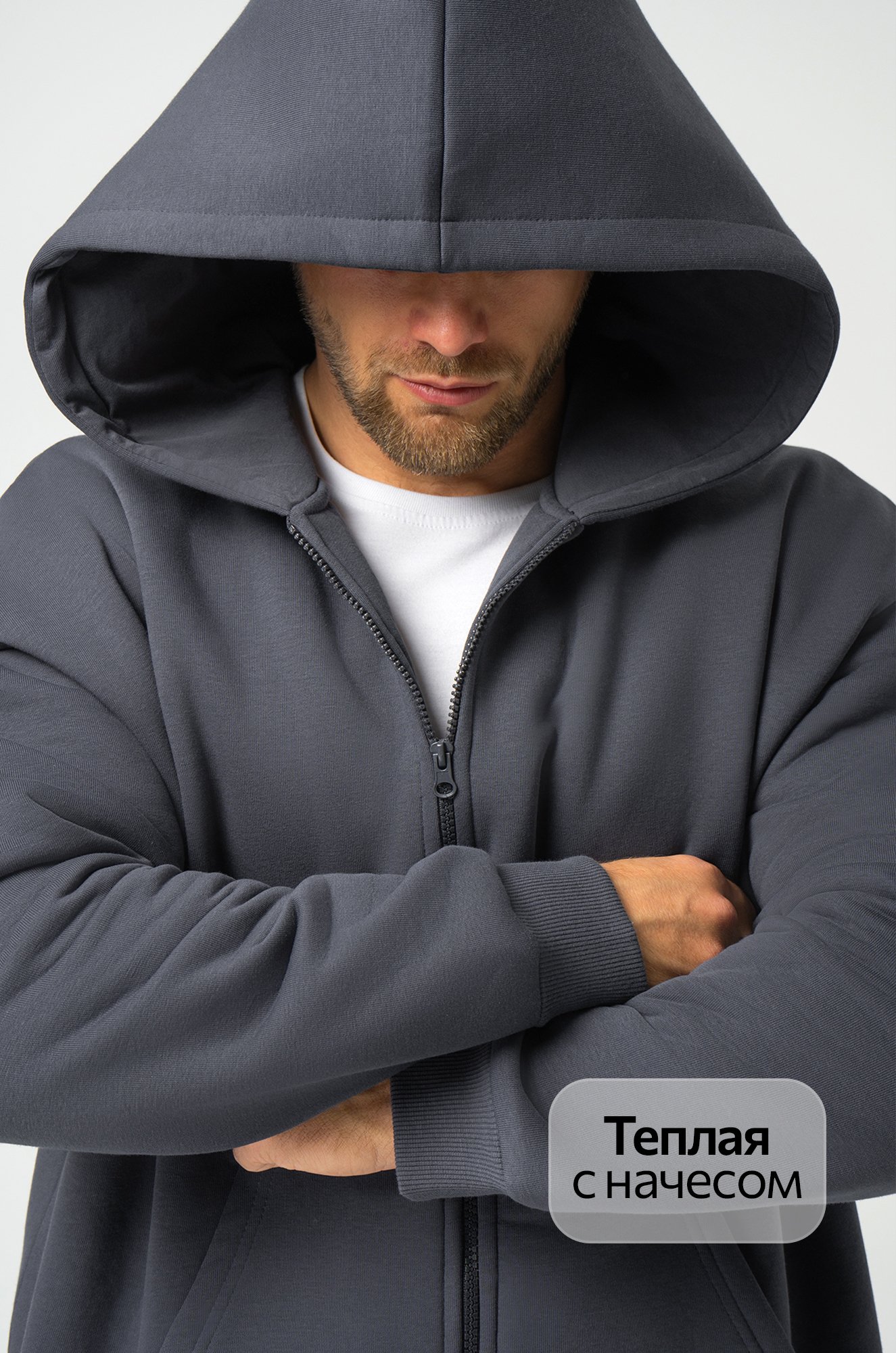 — темно-серое худи на молнии выполнено из трикотажной ткани футер с начёсом;